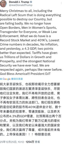 特朗普北京时间12月25日发文写道:“祝大家圣诞快乐,也祝那些竭尽全力想要摧毁我们国家的激进左翼渣滓圣诞快乐,尽管他们注定失败。我们不再有开放的边境,男子参加女子体育比赛,跨性别者合法化,也不再有软弱无力的执法部门。我们现在拥有的是创纪录的股市和401K退休金计划,数十年来最低的犯罪率,零通货膨胀,以及昨天公布的4.3%的GDP增速,比预期高出两个百分点。关税为我们带来了数万亿美元的增长和繁荣,以及我们有史以来最强大的国家安全。我们再次赢得了尊重,或许是前所未有的。上帝保佑美国!!!” 说到特朗普,大家应该都不陌生,他不只是美国第45任、第47任总统,还是个商人出身的政治人物,早年接手家族房地产企业,后来打造了自己的商业帝国,涉足酒店、高尔夫等多个领域。 在政治生涯里,他争议不断,2016年当选总统后推行“美国优先”政策,2021年卸任后又历经弹劾、刑事起诉等风波,最终在2024年总统选举中再次获胜,2025年1月重新就职。 这次圣诞发文,也延续了他一贯强硬且爱抨击对手的风格。 在这条发文中,特朗普重点强调了自己的施政成效:边境不再开放,叫停了男子参加女子体育比赛和跨性别者合法化,执法部门也不再“软弱”。 这些说法并非空穴来风,他重新就职后就签署行政令,明确联邦政府只承认男女两种性别,推翻了拜登政府的多元性别政策,在边境管控上也一直采取强硬措施。 经济方面,他更是列出了一长串“成绩单”:创纪录的股市和401K退休金计划、数十年来最低犯罪率、零通货膨胀,还有刚公布的4.3%GDP增速,比预期高出两个百分点。 关税政策也被他夸为“带来数万亿美元增长和繁荣”,还提升了国家安全水平。 但说白了,这些亮眼数据背后其实藏着隐忧,权威数据显示,美国第三季度4.3%的GDP增速确实存在,主要靠消费者支出和出口反弹拉动,但就业增长已经明显放缓,三季度月均新增就业仅5万人,远低于之前的水平,甚至有经济学家认为实际就业可能处于停滞状态。 所谓的“零通货膨胀”也不符合事实,核心通胀率仍高于美联储的目标,中低收入家庭的生活成本依然在上升。 特朗普选择在圣诞这个节点发布这样的内容,不难看出他的用意。 一方面是巩固支持者的信心,通过列举成果让选民觉得他的政策行之有效;另一方面,临近关键节点,抨击对手也是为了凝聚自身阵营的力量。 毕竟从过往来看,他经常在节日期间批评政敌,这种操作已经不算新鲜。 接下来的一段时间,这种政治对立可能还会持续,特朗普文中提到的政策,比如性别议题、边境管控,本身就极具争议性,很可能成为后续舆论交锋的焦点。 而经济数据的争议,也会让不同阵营进一步拉锯,毕竟亮眼的增速和民众的实际感受之间存在差距,这种矛盾很难在短时间内化解。 总的来说,这条圣诞发文既是特朗普个人风格的体现,也折射出美国当下的政治和社会分裂。经济成果有数据支撑,但背后的结构性问题同样不容忽视。 后续这些政策和数据会如何影响美国的发展,还有待观察。 以上都是个人观点,对此您有什么不同的看法,可以在评论区留言讨论!!!