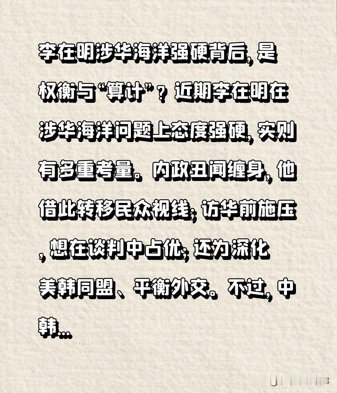 李在明涉华海洋强硬动作,暗藏权衡与“算计”? 近期,李在明在涉华海洋事务上态度强硬,背后有多重考量。他内政丑闻缠身,借此转移民众注意力;访华前施压,妄图在谈判中获利;还为深化美韩同盟、平衡外交。不过中韩友好是主流,这般“算计”难成气候,和平合作、互利共赢才是正道,双方应携手共进!