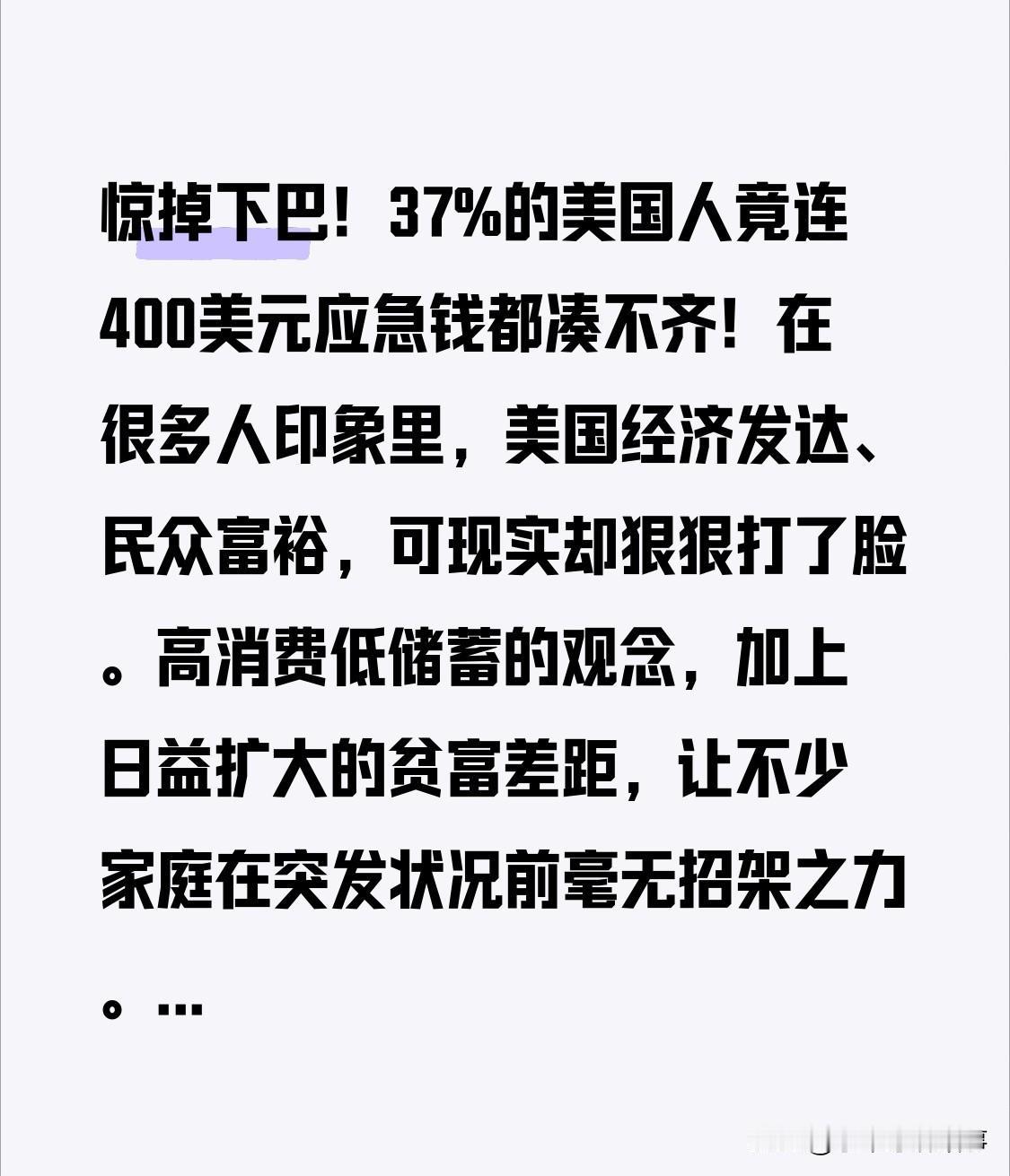 令人大跌眼镜!37%的美国人连400美元应急钱都凑不出!大众印象里,美国经济发达、民众富足,现实却残酷打脸。高消费低储蓄观念,叠加贫富差距扩大,使不少家庭面对突发状况无力应对。一场小病、一次汽车故障,就可能让他们陷入财务危机,值得美国反思,也为我们敲响警钟! 美国年人均收入 美国生活费用 美国财富真相