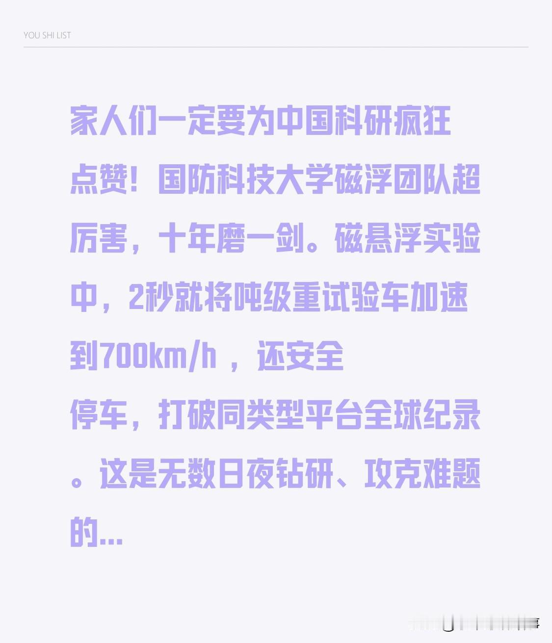 家人们一定要为中国科研疯狂点赞!国防科技大学磁浮团队超厉害,十年磨一剑。磁悬浮实验中,2秒就将吨级重试验车加速到700km/h ,还安全停车,打破同类型平台全球纪录。这是无数日夜钻研、攻克难题的成果。中国科研不断突破,超高速磁浮领先世界,未来交通、航天等都将受益,太振奋了! 友友们怎么看?振奋不?评论区聊聊