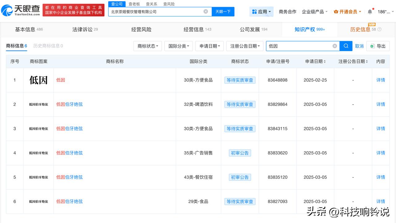 【霸王茶姬曾注册多个低因商标 霸王茶姬关联公司揭秘】霸王茶姬 咖啡因 近日,霸王茶姬因饮品中的咖啡因含量引发网友讨论。 天眼查知识产权信息显示,北京茶姬餐饮管理有限公司曾于2025年2月至3月期间申请注册多枚“低因”“低因伯牙绝弦”商标,国际分类涉及方便食品、啤酒饮料等,上述商标状态多为等待实质审查。 天眼查App显示,北京茶姬餐饮管理有限公司成立于2020年12月,法定代表人为张俊杰,注册资本约3800万人民币,经营范围包括餐饮管理、供应链管理服务、企业管理等。股东信息显示,该公司由CHAGEE INVESTMENT PTE.LTD.全资持股。 天眼查信息: