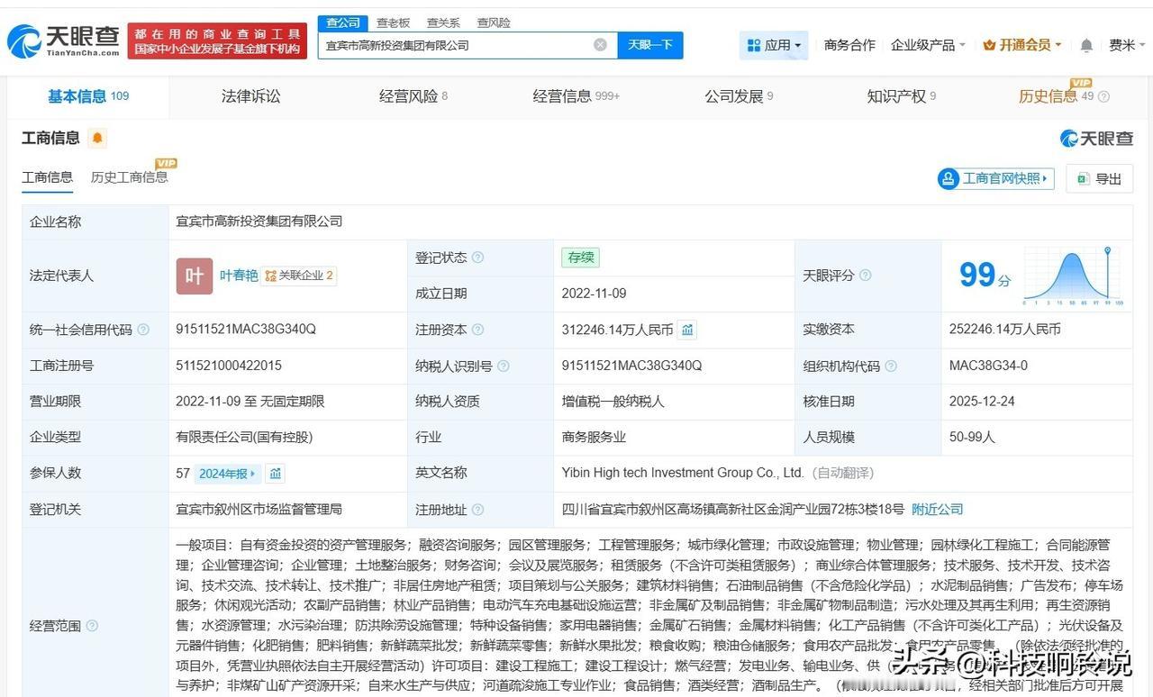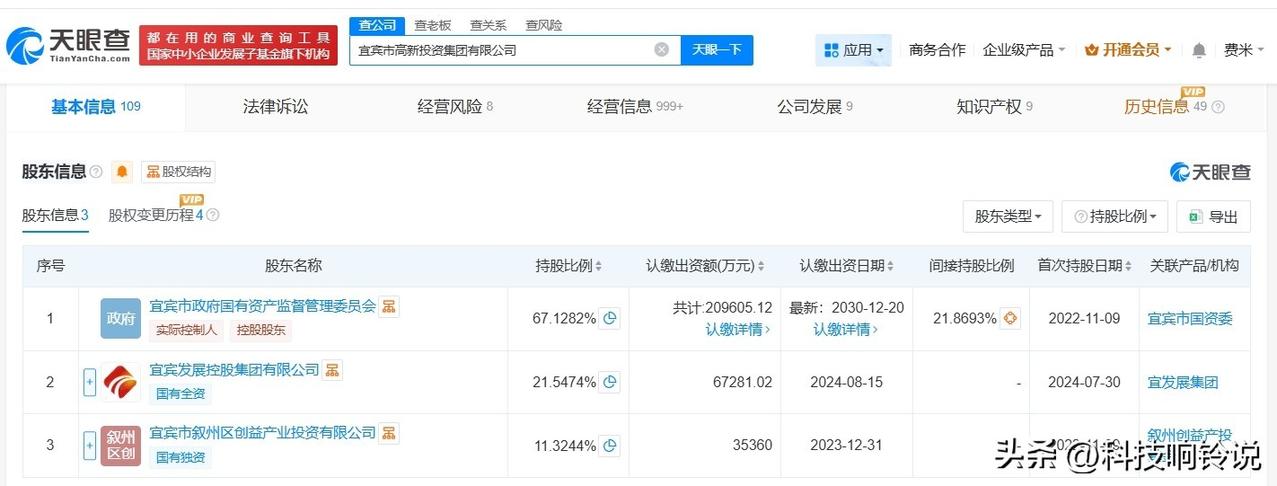 【宜宾市高新投资集团增资至31.2亿 增幅约13%】 天眼查App显示,近日,宜宾市高新投资集团有限公司发生工商变更,注册资本由约27.7亿人民币增至约31.2亿人民币,增幅约13%,同时多位高管发生变更。 该公司成立于2022年11月,法定代表人为叶春艳,经营范围包括自有资金投资的资产管理服务、融资咨询服务、园区管理服务、工程管理服务等,由宜宾市政府国有资产监督管理委员会、宜宾发展控股集团有限公司、宜宾市叙州区创益产业投资有限公司共同持股。 天眼查信息: