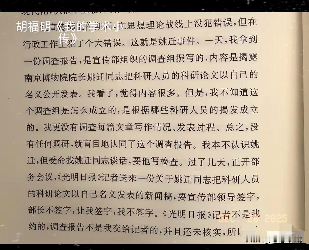 南博画卷案越挖越惊心, 居然还牵扯出几十年前的姚迁案, 这水是真的深不见底!1984年姚迁含冤自缢,1985年就被平反,转过年来,作为案件主要负责人的汪海粟就以“休养”名义离职,这时间线也太巧了吧? 同是当事人的胡福明,那位写出《实践是检验真理的唯一标准》的大佬,却因这案子受了严重警告。 多年后他在回忆录里写“受命找姚迁谈话”“拒绝签字报道”的细节,还叹着“书生从政真不行”,封面那句“坚持实事求是”更是戳心。 可见越是复杂的局面,越能照出人心真假,实事求是从来不是喊口号,而是要硬扛压力的勇气。 那些被掩盖的真相总会慢慢浮出水面,你觉得真正的公道,需要等多久才能完全落地?南博画作争议 南博文物失踪案
