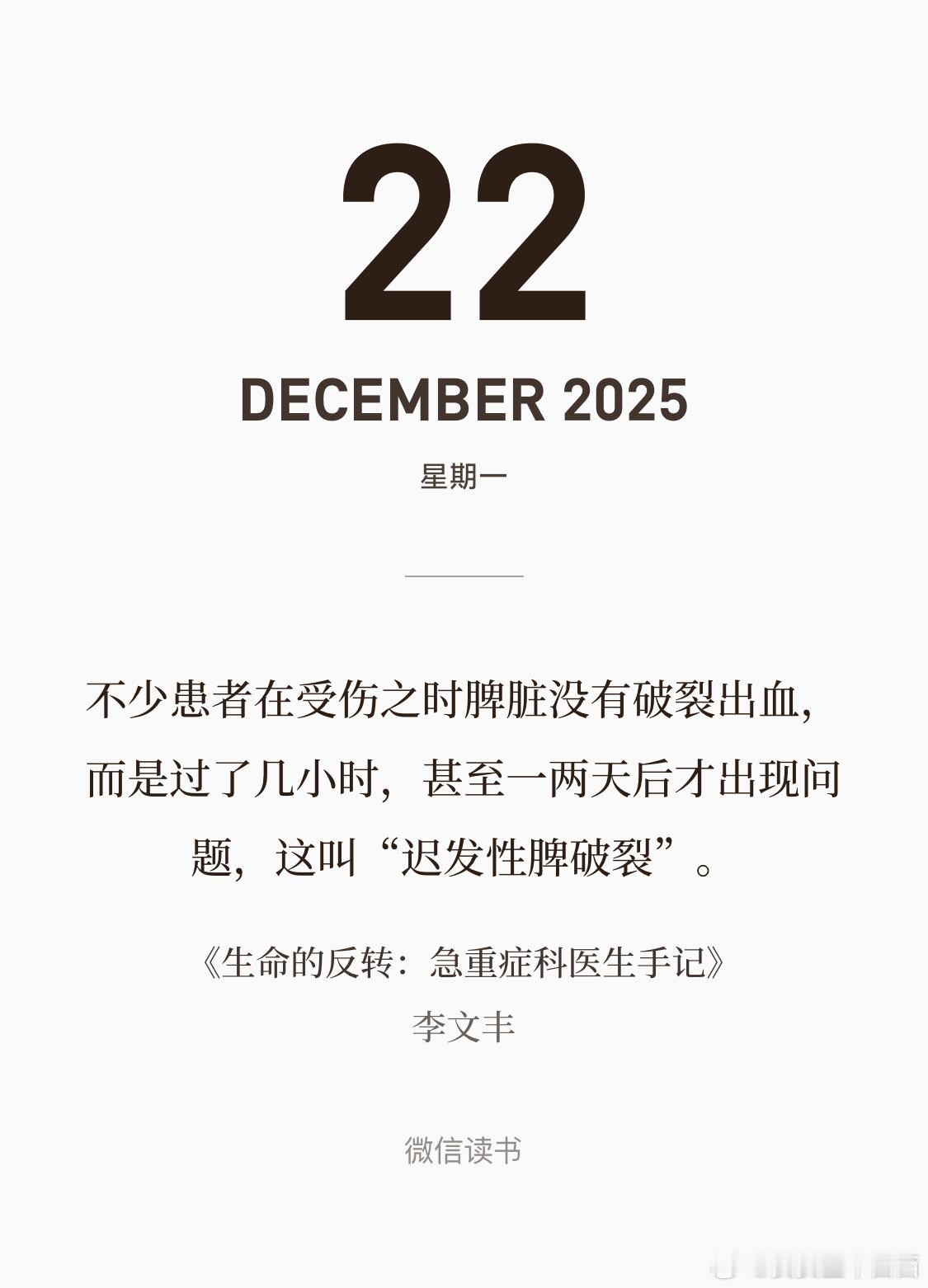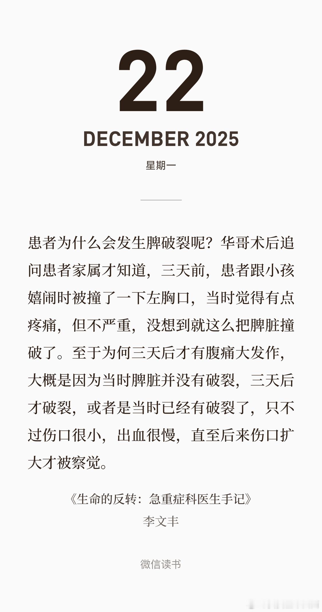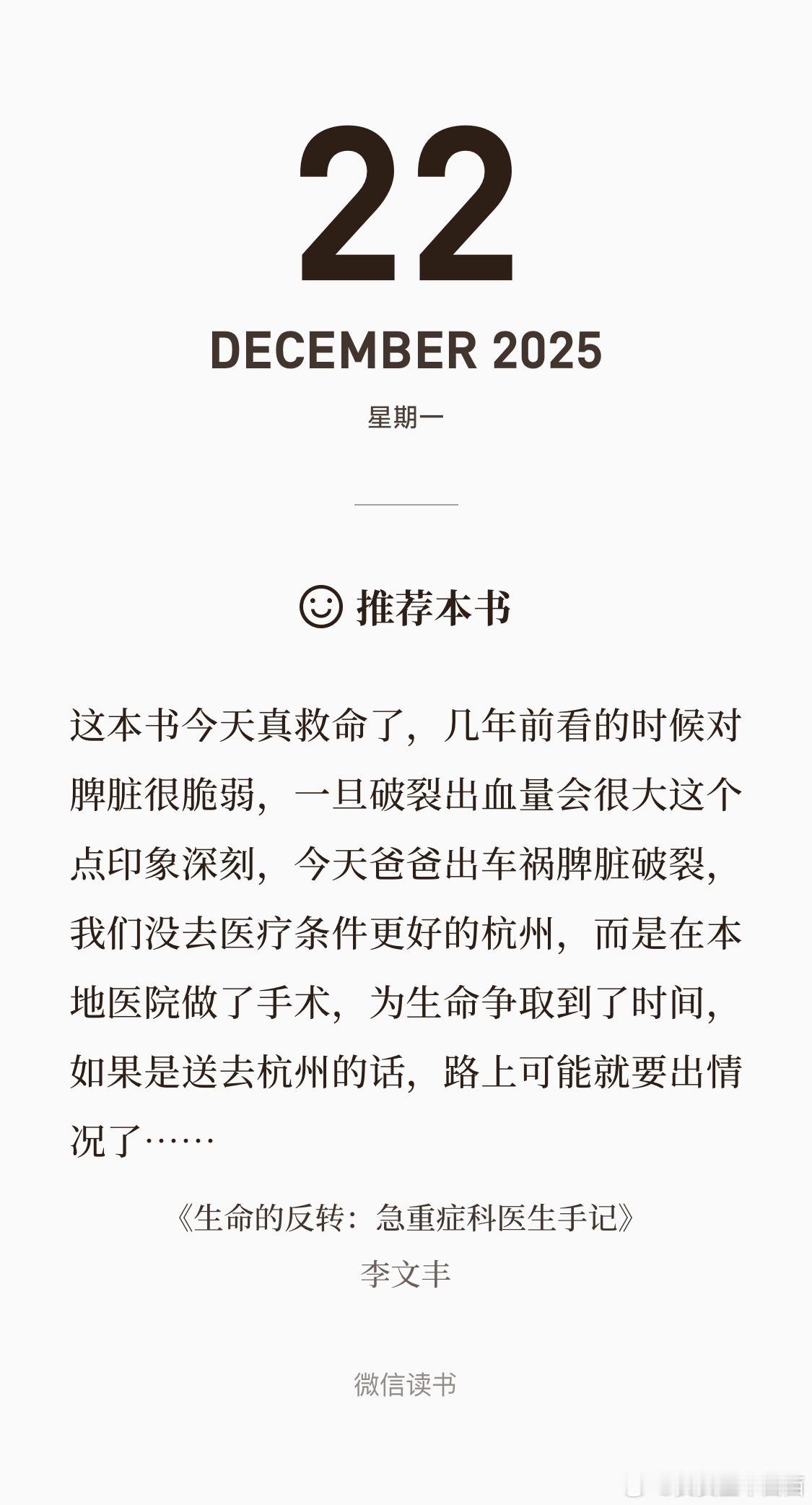 和大家推荐这本《生命的反转》,这回多亏我看过这本书,我爸爸真的实现了“生命的反转”。我很爱看这类和日常生活相关的工具书,想着我们普通人稍微懂点医学知识关键时候能救命,没想到真用上了。当时一口气看完这本书,关于脾脏就记得一个点:脾脏和豆腐一样嫩,碰一下就破,同时血流旺盛,一旦发生,死亡率很高。所以我听到爸爸脾脏破裂的时候马上联系了医生朋友,医生朋友联系了相关科室的医生在急诊室等我们,等我们到的时候,立马安排了一系列工作,不说别的,其中的增强CT环节就省了很多时间,到了急诊室里面就给他打了造影剂,立马开了CT单,人推回急诊室单子就出来了,立马开手术单进了手术室,看似很快,一路绿灯的情况下,从进急诊室到进手术室也花了将近一个小时的时间。如果不是一路绿灯,不敢想象。有人看到这里可能会想,如果我没有医生朋友认识怎么办?如果是我,我会在进急诊室的一瞬间大喊:“医生,我们脾脏破了!”或者在路上联系可能会有帮助的朋友,这个时候不要怕麻烦别人,毕竟生命最重要。这边想从病人家属的角度和大家分享下如果送人进急诊室要注意的一些事,希望大家用不到,但是用到的话能有帮助:1. 最好至少有两个人一起送病人去急诊室,一个人负责签字和听医生的吩咐,一个人负责缴费等一系列需要跑腿的事,两个人分工合作,可以节省很多时间。我爸爸在急诊室的时候,我看隔壁床的陪护人去办事了,护士一直叫人,情况很急,但是家属不在,没人签字。我们自己这边,我妈妈接了个电话,回过神来我们已经带着爸爸去做完CT回来了。2. 进了急诊室一切听医生的,插尿管就插尿管,剪衣服就剪衣服,不要觉得自己状况还不错就拒绝配合,医生护士也不想那么多事,急诊室的每个人都很忙,一切都是为生命争取时间。3. 病人进手术室后,在急诊室签字的那个人不要离开,手术中如果有什么事需要同一个人签字的,其他人不能代替。我爸爸做手术时,我因为吃不下饭,让阿莫斯带着妈妈去吃饭了,结果中途要签病危通知书和输血同意书,前期都是我妈妈签的,我没法代签,还好最后没让签,是术后补签的。4. 病人从手术室出来后进了ICU不要急,有的手术是需要在ICU观察一到两晚的,不一定是因为非常危急。图片是爸爸出事当晚进了ICU,我回家无事可做的时候,感到有点后怕,找到这本书的电子版又看了一遍关于脾脏部分的内容。从图3大家应该可以感受到脾脏的脆弱性,和孩子嬉闹撞一下都可能导致脾脏破裂……西西生活随记好书推荐