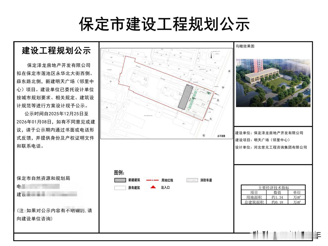 保定市明天广场项目建设工程规划公示 。 保定泽龙房地产开发有限公司拟在保定市莲池区永华北大街西侧、薛东路北侧,新建明天广场(邻里中心)项目。 很早之前好像规划的是一个教育什么的综合体,看来是该改规划了!
