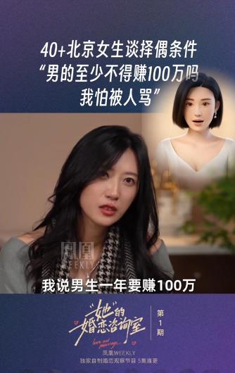 男的赚一百万一年不是最基本的吗? 凤凰网的婚恋观察节目,是一位40+的北京“精英女性”在谈择偶条件——她认为“男生一年赚100万是最基本的”,还补充说追她的人都符合这个标准,但这个说法引发了争议。 这话一出来,有人觉得离谱,也有人说可能是她所处的圈子本就如此。 这位女性是标准的精英群体,四十多岁,在北京生活打拼多年,她在节目里聊择偶条件时,先是有点顾虑怕被人骂,补充说100万不是硬指标,只是个大概数,但紧接着就强调,追她的人本来就都符合这个标准。 她还分享了一段过往经历,之前和两位体制内的大学同学聚会,聊到男生收入时,她随口说年薪百万是基本,结果同学俩直接笑了,说那她们的老公都得扔了,还调侃她“总算知道你为啥单着了”。 节目主持人倒是挺实在,直接点出了问题所在:就算是在北京,一年能赚50-60万的男人都已经站在金字塔尖了,这拨人几乎能随便挑,大概率会选年轻漂亮的姑娘,未必会考虑40+的女性,劝她现实点放宽经济条件。 可她没听进去,反而坚持经济收入是必选项,说结婚过日子经济肯定是最重要的,这只是基础证明,后续还得看有没有车房、性格好不好、父母通不通情达理。 说白了,这事儿之所以有争议,核心不是谁对谁错,而是不同圈层对“婚恋基本条件”的认知差太大了。 咱们普通人可能觉得年薪百万遥不可及,月薪五六千的话,甚至会觉得月入过万就已经很厉害。 但在这位女性所处的精英圈,周围都是谈项目、算营收的同行,百万年薪可能真就是常见水平,久而久之,她就把自己圈层里的“标配”,当成了婚恋市场的“通用门槛”。 有数据能说明这种差距,全国年入50万以上的人群不足1%,就算是机会最多的北京,1400万就业人口里,能拿到这个数的也就40-50万人,占比才3%左右。 年薪百万的比例就更低了,说是稀缺资源一点不为过。 可对这位精英女性来说,追她的人都能达到这个标准,她自然没法理解普通人的困惑,就像她体制内的同学没法理解她的择偶观一样,大家都活在自己的圈层认知里。 这其实也折射出当下大龄精英女性的婚恋困境,就像北京有不少30岁以上的单身女性,大多是高学历、高收入,早就习惯了优质的生活水准,找伴侣自然希望旗鼓相当。 可问题在于,她们眼里的“基本条件”,在整个社会里都是少数,而且优质男性的选择面更广,同龄的大多已经结婚,年轻的又更倾向于找年纪小的,这就让她们的择偶之路变得更窄。 婚姻里的择偶标准本就没有统一答案,有人看重安稳,有人看重匹配,本质上都是对美好生活的追求,只是当不同圈层的认知碰撞到一起,就容易引发争议。 对此您有什么不同的看法,可以在评论区留言讨论!!!