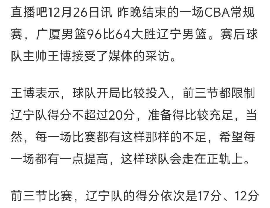杨鸣就没想和你打,王博还在那炫耀呢! 辽宁对阵广厦赛后,王博指导总结比赛时表示,每节比赛没让辽宁队超过20分,希望每场比赛球队都有提高,球队会走在正轨上! 能够看出王博指导在炫耀他们的防守有多厉害,给辽宁队打成这样,其实杨鸣就在赛前已经明确表示这场比赛锻炼阵容,拿广厦练兵!