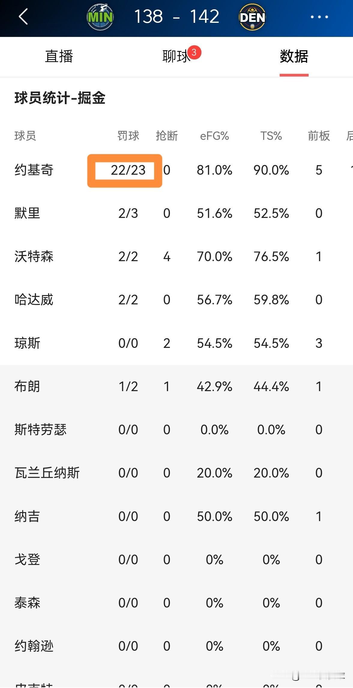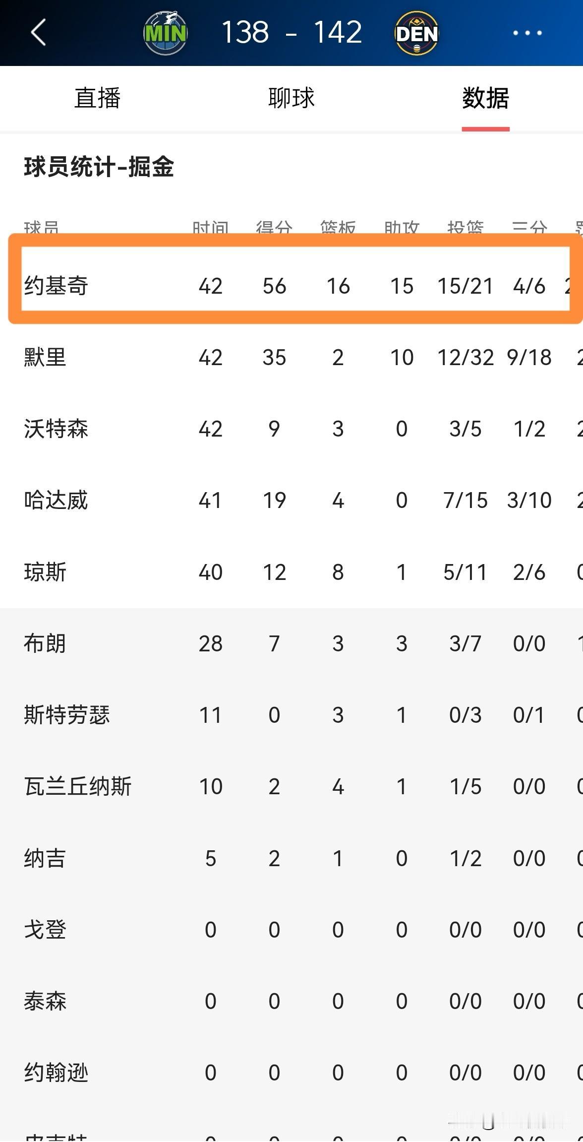 我忍不住要好好吹捧一下掘金巨星约基奇了!在今天掘金主场以142:138险胜森林狼的圣诞大战中,约基奇打出了历史级别的无解表现,真是让人大开眼界。 全场比赛下来,约基奇首发出战42分钟,投篮21中15,其中三分球6中4、罚球23中22疯狂的砍下56分16篮板15助攻2盖帽,他的场上正负值为全队并列最高的+15,他的场上效率值为不可思议的92。 天呐,对于约基奇的神级表现,我不得不承认“约基奇绝对是当今世界篮坛第一人”!