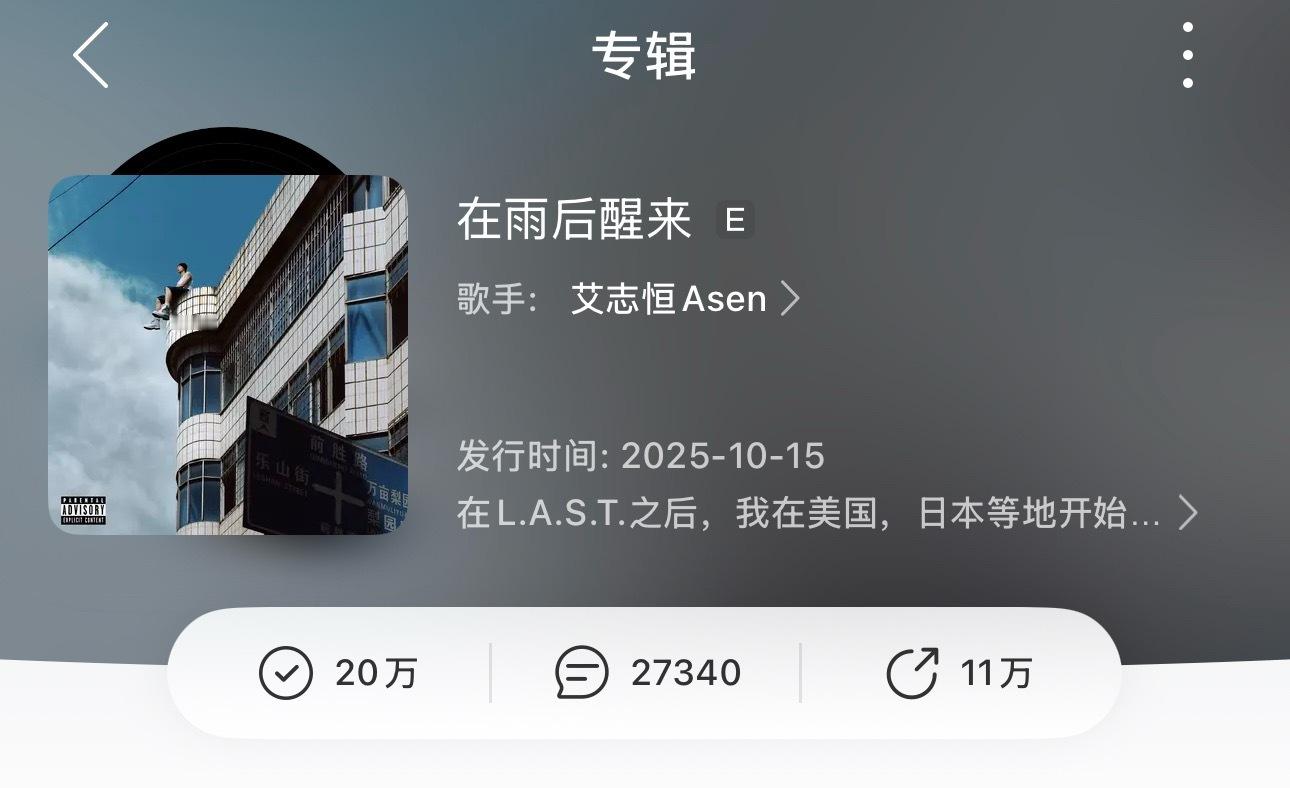 还在上升🔥Asen《在雨后醒来》收藏突破20W!稳坐中文说唱专辑历史第一收藏量!Asen