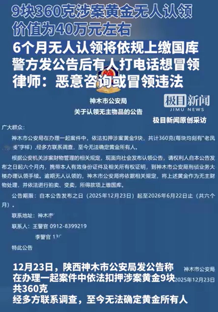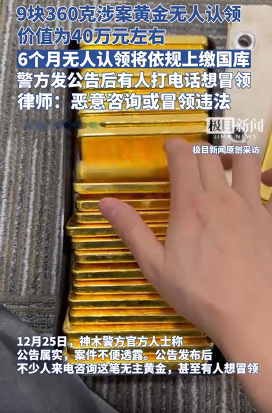 还真有胆子大的啊!陕西榆林,警方在办理一起案件时依法扣押9块涉案黄金,价值在40万左右,却始终无人认领,于是发布公告寻失主,可失主没找找到,想要冒领的人却不少 报道称,他们在办案过程中扣下了九块黄金,每块上都刻着老凤祥银楼的标,总共三百六十克,按市价算差不多值四十万。东西扣下了,可左查右查,硬是找不着主人是谁 眼看时间一长,黄金也不能一直扣着,警方只好启动公开寻主程序,希望真正的失主出来认领。公告里明确说,认领人需要在半年内带上身份证和所有权证明,比如购买发票或者鉴定证书,去警局办理手续 如果过了时间没认领,这些黄金就会被认定为无主财物,拍卖或变卖之后的钱上交国库 公告是发出去了,可真正的主人没露面,想冒领的电话倒是一个接一个。有的甚至凌晨两三点打来,开口就说金子是自己的,但一问细节、要凭证,就支支吾吾讲不清楚。办案民警也挺无奈,说这已经影响到正常工作了,没想到等不来失主,先等来一堆惦记横财的人 这事听起来有点像是现实版的“黄金迷局”。明明价值不菲,为何一直没人认领?是失主根本不知道金子被扣,还是因为来源说不清、不敢来领?我们无从得知 但可以确定的是,警方既然走了公示程序,就意味着认领绝不是凭一句话就能办成的。必须带着身份证、购买凭证这些实实在在的证明,核对得上才行。那些想蒙混过关的人,终究只是白费心思 要知道,冒领可不是随便打个电话就能解决的事,光靠嘴上说自己是失主,或者偷偷想捞点便宜,哪怕没成功,都可能被认定为企图侵占他人财物,那真是给自己找麻烦了