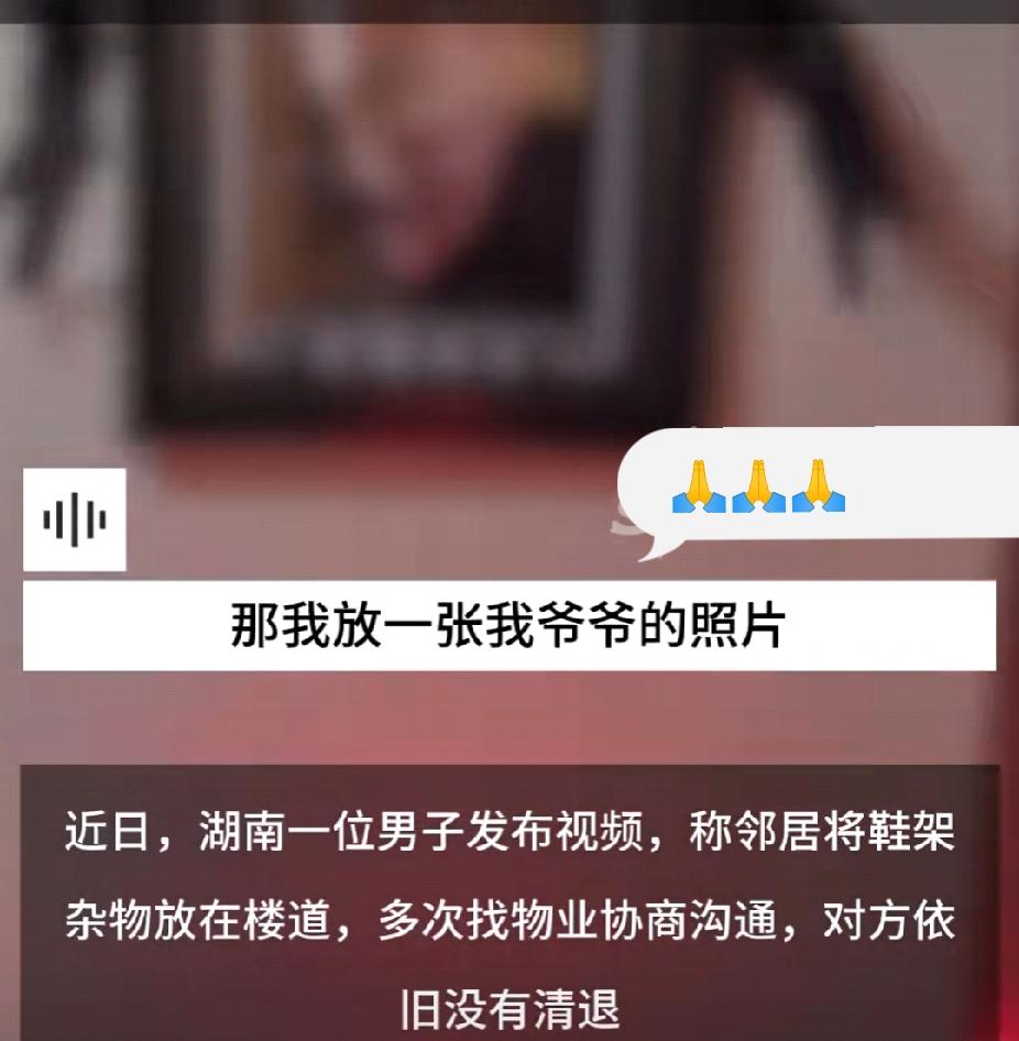 邻居将鞋架杂物放在楼道,男子多次与物业沟通无果后将爷爷“遗像”供在楼道,邻居:“我已经撤了!” 近日,湖南一男子发现邻居总是将家中杂物和这鞋架子放在楼道里,不仅正对着自己家门口,还散发出难闻的异味。 男子多次尝试让物业与对面邻居沟通,物业却总是说:“正在沟通,沟通也需要时间,再耐心等一等。” 等来等去,邻居却始终没有将这些杂物和鞋架清理出去,男子忍无可忍,想了一个办法! 本来供奉在家里的爷爷的遗照,男子直接连遗照带香火一起供奉到楼道里,正对着邻居家门口。邻居想必也是知道男子对自己家杂物堆楼道的事情有意见,只是故意一直不收拾,觉得男子拿他们没办法。 结果遗照挂上后,邻居火速处理了门口的杂物,该扔的扔,该拿进屋的拿进了屋,还将地面都拖的干干净净后发视频表示:“我已经撤了!” 其实言外之意就是:“我已经撤了,邻居你也快撤吧,把爷爷请回家吧!”其实邻居知道自己的行为会让人很厌烦,但在对方没有对付他的时候,总是存在侥幸心理! 哈哈,不得不说男子这招确实是“高”,一招制敌!但是该说的还是要说,对待逝者,还是要存有敬畏之心呀!邻居堆杂物 湖南