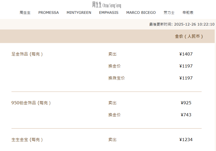 记者查询国内品牌金价,周生生足金饰品标价1407元/克,较前一日1397元/克的价格上涨10元/克。老凤祥足金饰品标价1413元/克,较前一日1398元/克的价格上涨15元/克。