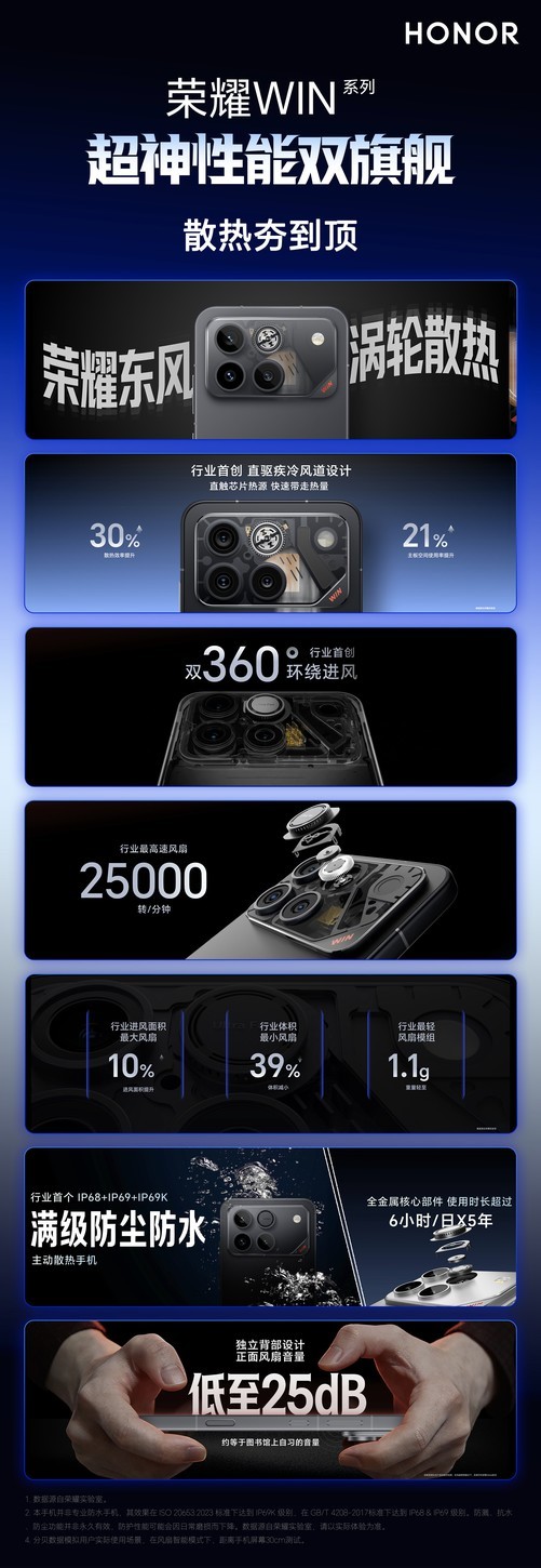 散热系统方面,荣耀重点展示了其内置风扇的散热设计。该系统采用了直驱风道与3D蝶翼VC散热组合,内置风扇转速可达每分钟25000转,旨在通过主动散热提升高负载场景下的性能表现,官方公布的安兔兔跑分数据超过了440万分。