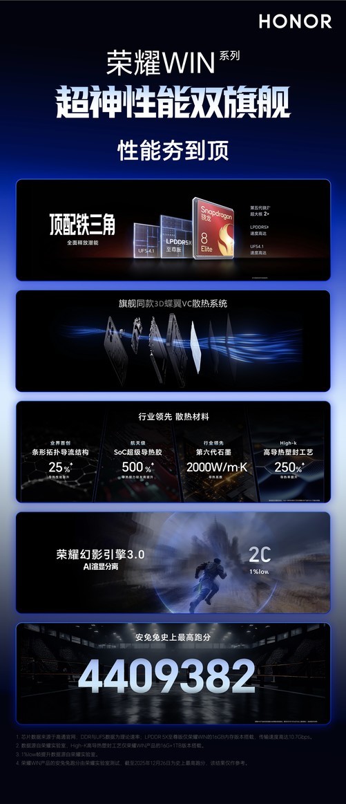 [ZOL中关村在线原创新闻]荣耀于12月26日正式发布了全新的荣耀WIN系列手机,包括荣耀WIN和荣耀WINRT两款产品,该系列主打高性能游戏体验,在散热结构与电池续航上进行了显著的硬件堆叠。