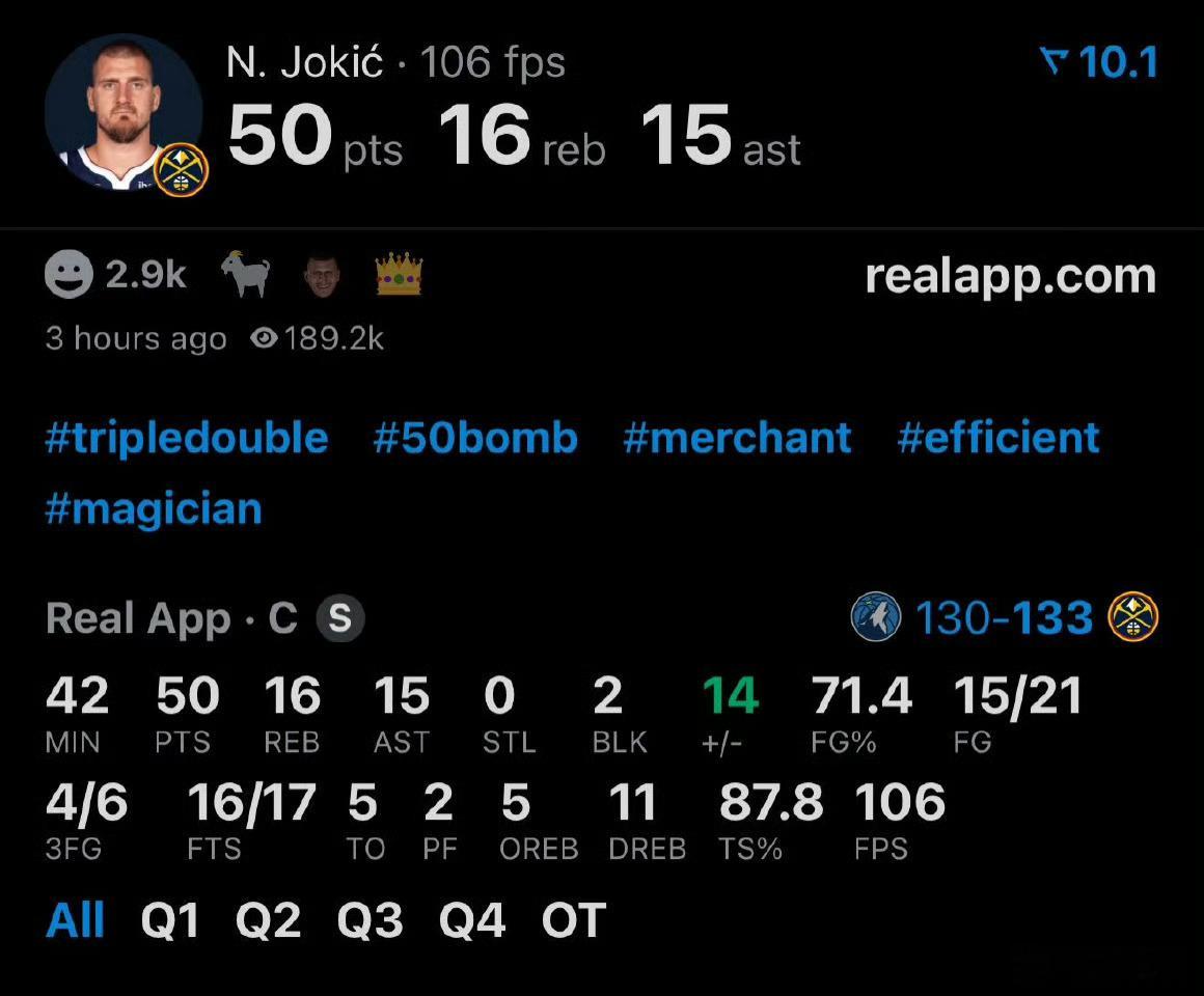 约基奇超神砍下50➕16篮板➕15助攻大三双,掘金加时战胜森林狼!全场21投中15,三分6中4,17罚16中得到50分森林狼vs掘金