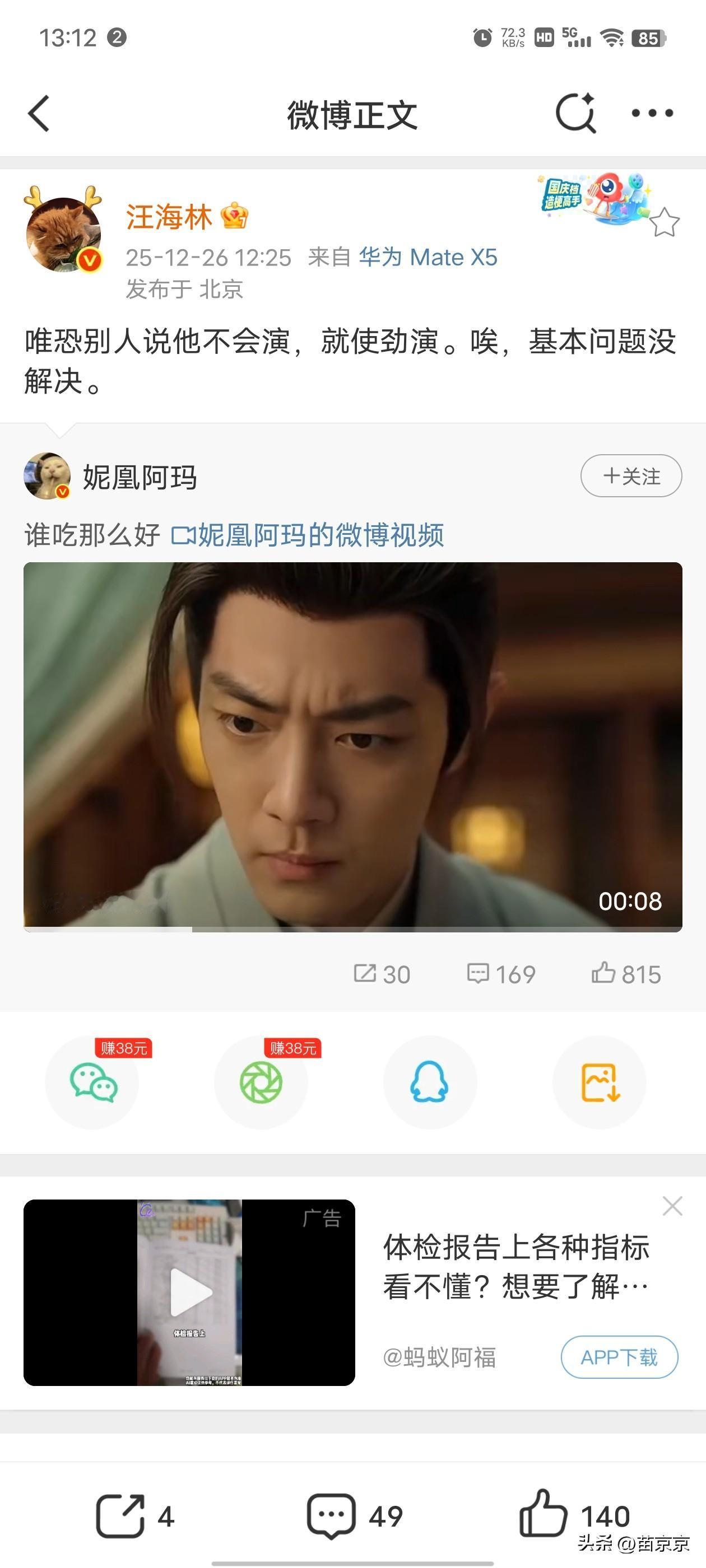 汪海林开撕肖战!五分钟连发两条微博直指肖战。一条嘲讽怕人说不会演就使劲演,另一条只写好毒辣的计策啊配个赞。两条都明晃晃配上肖战影视片段,简直是把说的就是你打公屏上。 一个犀利敢说,一个顶级流量,这种直接点名批评在圈内还真少见。