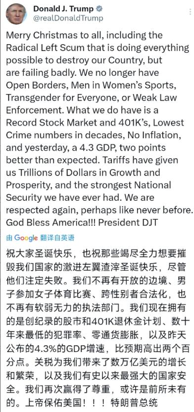 圣诞节当日,特朗普再次发文挑衅!12月25日,特朗普发文:“祝大家圣诞节快乐,也祝那些试图摧毁美国的激进左翼圣诞快乐,尽管他们注定失败。” 距离2026年国会中期选举只剩不到一年,当前特朗普的支持率并不乐观,综合民调显示仅为43.6%,尤其是在民众最关心的通胀问题上,认可率低至35%。 在这样的背景下,借节日热度发声,既能巩固保守派基本盘,又能借机攻击民主党对手,对他来说无疑是性价比很高的政治造势。 特朗普这篇发文里,明里暗里都在针对民主党,这和他一贯的执政思路分不开。 自从2025年1月再度入主白宫,他就多次把经济疲软、移民混乱等问题甩给前任拜登政府,这次也不例外。 他此前多次抨击拜登政府的移民政策,称其放宽绿卡申请渠道,让非法移民大量涌入美国,给政府带来了沉重的财政负担。 有数据显示,拜登上任以来,联邦政府在非法移民问题上的总支出高达728亿美元,州和地方支出更是超过1156亿美元,平均每个非法移民每年要让纳税人负担8776美元。 不过有意思的是,特朗普自己执政末年,非法越境逮捕人数其实比奥巴马时期还高,美国的移民问题早已陷入“愈治愈乱”的怪圈。 除了暗讽对手,特朗普在近期的公开表态里还忙着给自己“贴金”。 不管是圣诞发文的隐含表述,还是此前的全国讲话,他都在反复强调自己的“执政成就”,比如宣称建立了“美国历史上最坚固的边境”,还为美国争取到了18万亿美元投资。 但这些说法很快就被美媒事实核查打脸,白宫近期公布的投资数据实际是9.6万亿美元,所谓的“通胀停止”也与现实不符,9月美国消费者价格指数还创下了年内新高。 这种夸大其词的自夸,不仅没起到提振民意的效果,反而让更多人觉得脱离现实。 要知道现在的美国民众,日子过得并不轻松。 2025年11月美国失业率升至4.6%,是2021年10月以来的最高水平,近半数受访者表示在食品、住房、医疗等日常开销上承受着巨大压力。 之前那场长达43天的联邦政府停摆,更是让数百万旅客受航班延误影响,4000多万低收入人群的食品救济项目中断,大量联邦雇员只能无薪度日。 民众需要的是切实的解决方案,而不是节日里的政治攻击和虚无缥缈的政绩吹嘘。 特朗普之所以执着于这种操作,本质上还是想靠“表演式政治”转移民众视线。 毕竟当前共和党在中期选举中的选情并不乐观,白宫内部甚至已经预判,可能会因为未能兑现经济承诺而失去国会控制权。 他试图把民众的不满引向民主党,用对对手的批判掩盖自己执政中的短板,这种套路在过去或许能奏效,但现在越来越难让民众买账。 有分析指出,随着执政时间的推移,民众对高通胀、高物价的不满,已经逐渐从拜登政府转向了现任政府,此时继续甩锅和自夸,反而可能引发民意反噬。 其实在美国当前的政治环境里,两党对立早已不是新鲜事,从财政支出到移民管控,从医保福利到关税政策,双方几乎在所有议题上都在相互攻讦。 但这种无休止的党争,最终伤害的还是普通民众的利益,让民生福祉成了政治博弈的筹码。 特朗普的圣诞发文,不过是这场持续内耗的一个缩影。 对此您怎么看?欢迎在评论区留下你的看法。