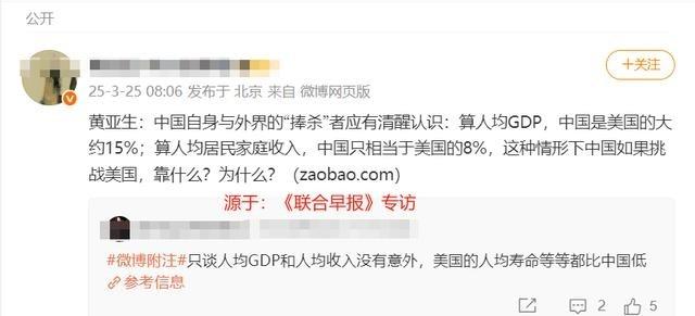 “中国拿什么挑战美国?人均收入只有人家的 8%!” 就是这位中国经济领域专家 —— 黄亚生,他劝告中国人不要相信 “唱衰美国论”。这一句点破了很多人心里的虚火,也让那些沉浸在 “赶英超美” 口号中的人一下子安静下来。 黄亚生的判断并非凭空而来,而是基于扎实的数据与多年的研究。以 2024 年的数字为例,中国人均 GDP 大约 1.32 万美元,而美国已超过 8.5 万美元,人均比值只有 15%。 如果换成人均居民收入,2024 年中国全国居民人均可支配收入 41314 元(约 5700 美元),农村居民人均可支配收入 23119 元,而 2023 年美国通胀调整后家庭中位收入约 7万多美元,差距客观存在。这背后,是美国百年技术积累和高效的资源配置能力在发挥作用。 从总量上看,中国的经济规模确实惊人,制造业产能全球领先(2023 年占全球制造业增加值比重超 30%),出口额遥遥指向第一。但黄亚生提醒,依赖出口这条路风险太高,内需不足使经济容易受外部冲击。 一旦国际环境动荡,尤其贸易摩擦加剧,订单波动会迅速传导到就业。据测算,中美贸易战中涉及 2500 亿美元加征关税的部分,可能影响约 942.5 万个就业岗位,且冲击通过劳动力市场网络产生广泛涟漪效应。 国际机构的报告显示,2024 年 9 月美国私营部门平均时薪 31.25 美元,中国制造业平均时薪约 6-8 美元(因行业 / 地区差异较大),这差距不仅意味着消费能力不足,更拖慢了技术升级的步伐。 中国在新能源汽车、高铁等领域已具备竞争力,甚至部分技术出口到发达国家,但这些亮点无法覆盖整体短板。在全球产业链上,美国掌握大量核心专利,而中国更多参与组装环节,2023 年中国最终消费支出约 6 万亿美元,是全球第二大消费市场。 一大原因是城乡收入仍有差距。2024 年农村居民人均财产净收入 580 元,占可支配收入比重仅 2.51%,农村土地制度改革正在持续深化,通过完善土地增值收益分配机制提升农民财产性收入,这一问题正逐步改善。 中国 14 亿人口本应构成巨大市场,却因结构问题形成对外市场依赖。“一带一路” 可以开拓新市场,但体量有限,如俄罗斯经济总量仅相当于广东省。长远来讲,中国必须提升全要素生产率,通过技术升级改善趋势。 在专利方面,中国申请量位居世界第一,但质量与原创突破不足,尤其在人工智能领域,许多应用依赖美国的基础模型。如果没有底层创新能力,这种跟跑模式无法长期支撑竞争力。 美国的高购买力市场能不断推动企业研发,而中国消费仍集中在基础品,限制了高端产业的扩展空间。黄亚生还指出,地方财政依赖低成本征地与卖地收入透支了农村发展,延续低收入结构只会固化低附加值产业格局。 中国要想缩小差距,需要让民营经济释放活力,提高资源配置精准度。在此过程中,中国的贸易策略已明显成熟,面对摩擦不盲目硬碰硬,而是温和且有针对性地回应,这为国内争取了缓冲期。 目前,中国电动车与 5G 设备在全球市场领先份额,2023 年专利申请量超过全球一半,说明创新意识已提升。但要真正从数量走向质量,需要强化知识产权保护和原创技术研发。 黄亚生强调,不应沉迷于唱衰美国的情绪化言论,也不能被外界的过度赞誉冲昏头脑,冷静认知差距才是稳健发展的基础。 面对全球供应链重构,中国企业加快布局本土供应链,过剩产能需要内需消化而非依赖出口。消费不足与就业压力并存,教育改革与技能培训将是改变劳动力素质的长期手段。 中国正处于转型窗口期,美国老龄化速度更慢,这意味着时间有限。制造业附加值率偏低的问题必须通过自主品牌建设来提高溢价。