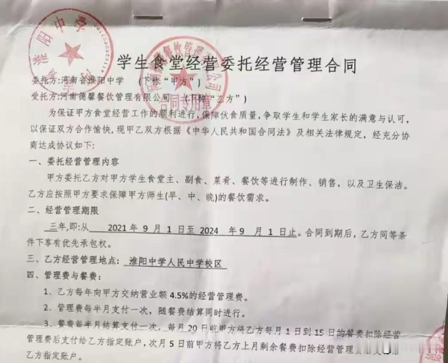食堂承包商实名举报校领导!学生餐费竟被拿走300多万?! 这件事真的越看越气。 河南周口淮阳中学的食堂承包商马蕤最近实名举报:2022年9月到2024年7月,校领导让后勤负责人从学生餐费里抽15%的“返点”,两年下来足足拿走了330多万元现金! 关键是,合同里明明写的是4.5%的管理费,结果校方突然涨成15%,还说“不愿意交就走人”。承包商前期投入不少,只能被迫照做。餐费先打给她,再让她取现金返还,2023年4月一笔就返了67万多,聊天记录和流水都有。 更让人心凉的是,这是全封闭学校,学生每天20元餐费本应全部用在吃上。国家也明确要求中小学食堂要坚持公益性,不能挪用伙食费。但校方却回应说,这笔钱是“违规收取”,用来给老师发津贴? 目前市、区纪委都已介入调查,教育局也在征集线索。学生的饭碗不是“提款机”,希望这次能查个水落石出,给家长和学生一个交代!