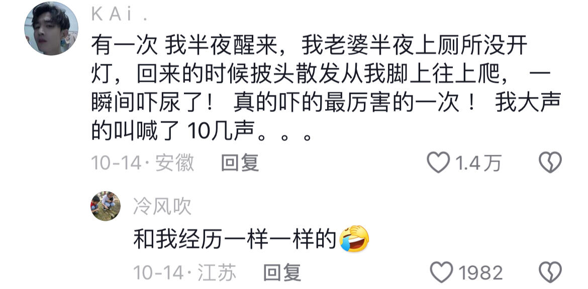 有一次我半夜醒来,我老婆半夜上厕所没开灯,回来的时候披头散发从我脚上往上爬,一瞬间吓尿了!