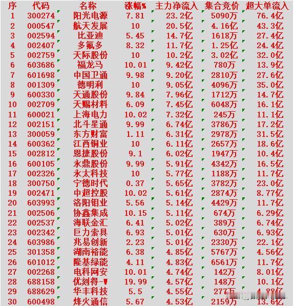 12月26日收盘,主力资金,已经大幅卖出的30名单: 航天电子:净流入 -19.4 亿元 工业富联:净流入 -15.8 亿元 胜宏科技:净流入 -13.8 亿元 中际旭创:净流入 -13.1 亿元 新易盛:净流入 -13.1 亿元 再升科技:净流入 -10.2 亿元 中科曙光:净流入 -10.1 亿元 西部材料:净流入 -7.57 亿元 领益智造:净流入 -7.48 亿元 三花智控:净流入 -7.13 亿元 飞龙股份:净流入 -6.50 亿元 北京君正:净流入 -6.45 亿元 英维克:净流入 -6.36 亿元 赛微电子:净流入 -6.34 亿元 12月26日收盘,主力资金“大幅买入”的30名单: 阳光电源:涨幅 7.81%,净流入 23.2 亿元 航天发展:涨幅 10.00%(涨停),净流入 20.5 亿元 比亚迪:涨幅 5.45%,净流入 14.7 亿元 多氟多:涨幅 8.32%,净流入 11.7 亿元 天际股份:涨幅 10.00%(涨停),净流入 10.2 亿元 福龙马:涨幅 10.01%(涨停),净流入 9.42 亿元 中国卫通:涨幅 9.98%(涨停),净流入 9.20 亿元 德明利:涨幅 10.00%(涨停),净流入 9.05 亿元 天通股份:涨幅 9.84%,净流入 7.96 亿元 天赐材料:涨幅 6.09%,净流入 7.45 亿元 上海电力:涨幅 10.02%(涨停),净流入 7.32 亿元 北斗星通:涨幅 9.99%(涨停),净流入 6.74 亿元 东方财富:涨幅 1.11%,净流入 6.31 亿元 江西铜业:涨幅 10.00%(涨停),净流入 6.11 亿元 恩捷股份:涨幅 9.10%,净流入 6.02 亿元 永鼎股份:涨幅 9.99%(涨停),净流入 5.91 亿元 永太科技:涨幅 10.00%(涨停),净流入 5.77 亿元 宁德时代:涨幅 0.37%,净流入 5.65 亿元 中超控股:涨幅 10.02%(涨停),净流入 5.61 亿元