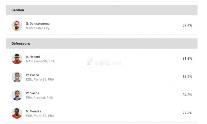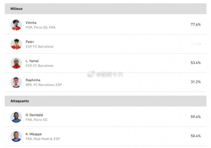 队报球迷票选2025年度11人:中前场巴萨占3席,锋线姆巴佩+登贝莱 12月26日讯 法国媒体《队报》发起投票,让网友投票选出2025年的年度最佳11人。最终票选出的球员如下所示,其中,中后卫、防守中场、进攻中场、前锋4个选项,都可以在候选球员中选择2人,最终阵容为442。位置+球员(得票率)门将:多纳鲁马 59.4%右后卫:阿什拉夫 81.6%中后卫:(选2人)帕乔 56.4%、萨利巴 34.2%左后卫:门德斯 77.6%防守中场/全能中场:(选2人)维蒂尼亚 77.6%、佩德里 34.2%进攻中场/边锋:(选2人)亚马尔 53.4%、拉菲尼亚 31.2%前锋:(选2人)登贝莱 59.4%、姆巴佩 50.4%主帅:恩里克76.6%