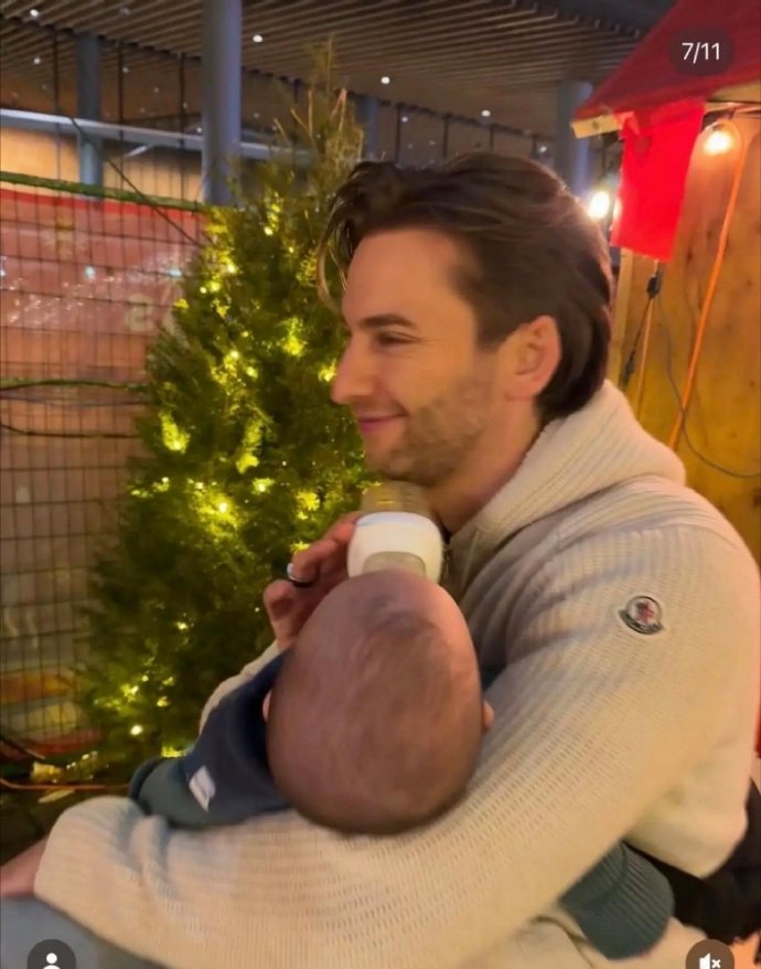 谢婷婷一家过圣诞,半岁儿子肉脸白胖像爸爸,小7岁男友细心喂奶