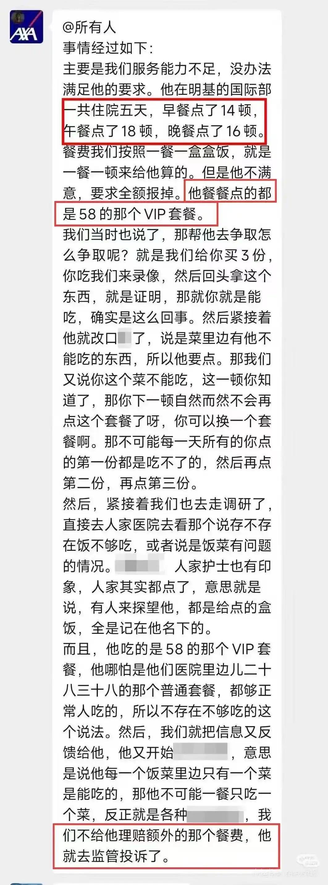 吵翻天!一男子在网上吐槽,年底准备和保险公司续保后,发现被拒了,随后他又想给家人换其他保险公司也被风控。结果保险公司回复:住院5天点了48顿VIP餐,不仅自己吃,还给别人吃! 据男子介绍,他们一家三口连续四年在这家公司投保,今年12月16日到期,他提前几天找经纪人办续保,系统却提示多次投保未成功,想换其他家投保,结果也被卡住 不少人第一反应是看不懂。保险公司不是收钱的生意吗,钱送上门为什么不赚?事情往下看,就没那么简单了 这份保险属于一年期的中端医疗险,住院0免赔,能进国际部、特需部、VIP病房,连陪护费和餐费都能报。看着舒服,用起来也宽松,不过有个关键点,这类产品不保证续保,到期要重新审核,保险公司有决定权。问题出在理赔上 保险公司后来回应,该客户在某医院国际部住院5天,一共点了48顿VIP套餐。早餐14顿,午餐18顿,晚餐16顿,每份58元。除了自己吃,来探望的亲友也一起吃,费用统一记在他名下,全部申请报销 男子解释说,是因为每顿餐里面自己只有一个菜能吃,所以才多点了两份,但保险公司并不认可这种说法,认为明显超出合理范围,拒赔部分餐费 双方因此产生纠纷,客户向监管部门投诉。最终理赔还是完成了,只是到了续保节点,保险公司选择不再接受这份风险 对此,网友们也是看法不一 有网友认为:能一年 5000 多买保险的,他吃一顿 58,你觉得贵,可这是人家日常正常消费而已!你续保规则里面有这个伙食标准的话,我估计都不会这样 但也有网友表示:哪有这样薅羊毛的,都这样以后不用去饭店了,直接买这个保险,然后请全村吃席 这两种声音,其实都没说错,只是站的位置不一样 觉得58一顿不贵的人,关注的是个人消费水平。一年五千多的保费,住的是国际部、VIP病房,点58的套餐,在现实生活里确实算不上奢侈,更谈不上离谱。更关键的一点在于,保险条款里写了可以报销膳食费,却没把标准说清楚。没写清上限、没写清人数、没写清适用范围,那从普通用户视角出发,只要不违法、不造假,按条款走,很难说他一定越界。规则模糊,必然会有人按对自己最有利的方式去理解 觉得这是薅羊毛的人,看的是体系能不能承受。如果住院5天能点48顿饭,还能把探望亲友的餐费一并算进去,那这已经不是吃得好不好,而是把保险当成了饭票。一旦这种用法被默认为合理,保险公司就不需要精算了,直接改成包吃包喝就行。最终的结果,只会是保费上涨、限制变多,甚至产品直接下架,最后买单的还是大多数正常使用的人 这件事的真正矛盾点,不在58元,而在边界。不是价格问题,是性质问题。医疗险报的是治疗过程中合理、必要的支出,餐费的本意是补偿住院期间的基本饮食,而不是承担社交成本 哪怕你自己天天吃高价套餐,也很难说把别人一起吃的费用算进来是合理的。对用户来说,把规则用到极限,可能赢了一次理赔,却输掉了以后所有选择