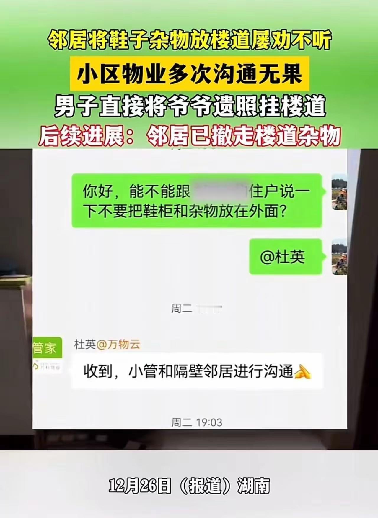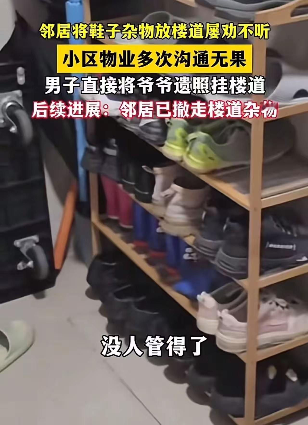 惊到我了!挂遗照竟成治服自私邻居的绝招! 小区里这事儿太离谱了!某户人家对门邻居真不地道,楼道本就不宽,直接把鞋架堆在公共区域,占了大半地方,那股鞋臭味儿熏得人直皱眉。 邻居好声好气劝了三回,对方横得不行,说没挡道就不管不顾。找物业投诉两回,物业上门协调也没用,人家压根不当回事。 没辙之下,这户人家被逼急了,直接把爷爷的遗照挂在楼道里,还摆了小供台点了香。谁能料到,第二天邻居出门见着遗照,脸都白了,站在那儿不敢靠近。 等晚上下班再看,鞋架早没影了!楼道干干净净的,臭味也散了。 公共区域本就该大家共用,自私自利迟早栽跟头,这波操作虽偏门,但对付不讲理的人是真解气! 邻里矛盾那些事 公共区域别乱占 生活里的奇葩事