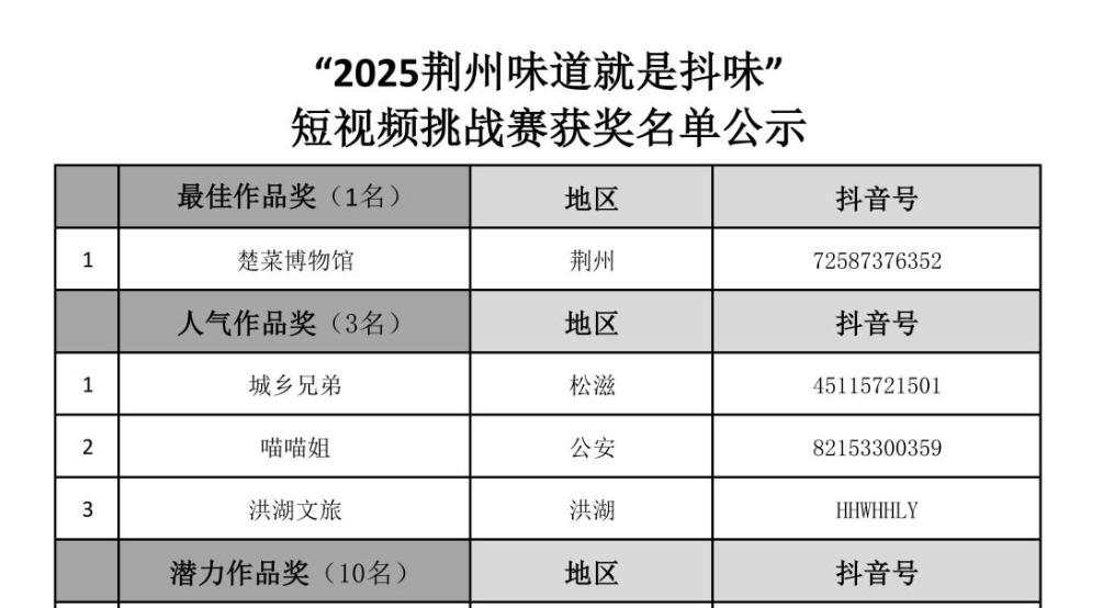 近日,由中共荆州市委、荆州市人民政府主办,荆州市农业农村局、荆州市传媒集团承办,荆州市商务局、荆州市网信中心、荆州市机关事务服务中心、荆州市总工会协办的“2025荆州味道就是抖味”短视频挑战赛历时五个月落下帷幕。
