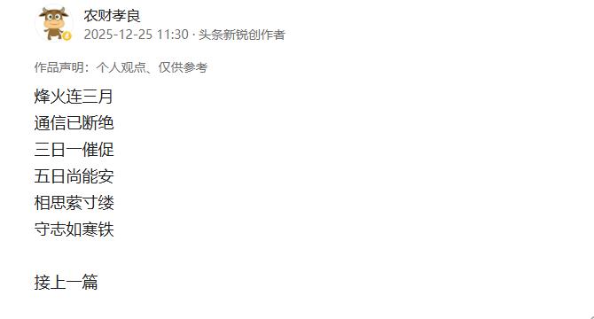 中长期的利好也来啦! 昨天的打油诗不工整,只图大家看个明白 前2句是名字 中间 2句 一句是三成已如 另一句是5成持有才安心 最后两句是我买了就不动,持有就对了。有多个牛股基因 刚刚又设立了创投基金,这个时候就有了情绪价值。 昨天可能很多人都不会这样做 那个位置入场,跌了不是找骂吗? 但是机会就是机会 在市场上没有这样的转场和临判,那就是散财童子 昨天我入场,知道一些铁粉不知所措。 那么短时间大家买的估计都是坑 那就做事形成闭环 才有了打油诗 由于时间和语文功底限制,不然高低整个8句 最后2句想了想 盼得烽烟尽,登高迎新年