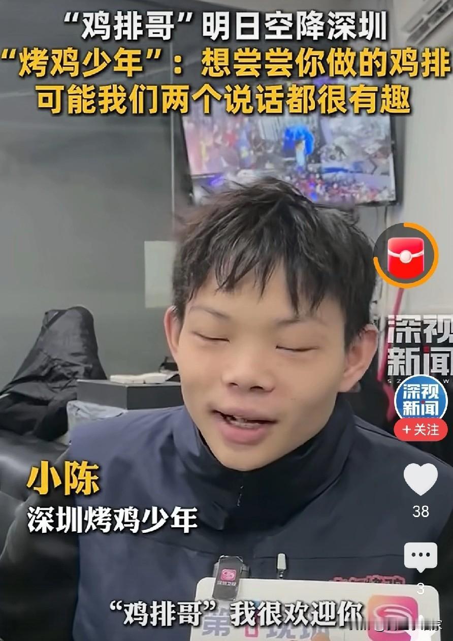 现在这是谁蹭谁的流量了呢,鸡排哥要去深圳开启大湾区的“巡炸”了,两个因为“鸡”而火到一堆的新时代“网红”,准备要顶峰相见了。 近日,烤鸡少年听说景德镇的“鸡排哥”要来深圳了,邀请鸡排哥一起切磋味道,一个炸鸡排,一个烤鸡。我就想问,这么多鸡大家还没吃够的吗? 有人说,是鸡排哥借深圳的烟火气延续热度,也有人说,是烤鸡少年借着跨界互动扩大影响力。两个人都是靠会说话走红网络,一频频爆金句给你情绪价值,另一个小小的年纪却已经道尽了沧桑。 最后想问大家:你觉得这场鸡界顶流的碰面,是鸡排哥的金句更圈粉,还是烤鸡少年的沧桑感更吸引人呢?