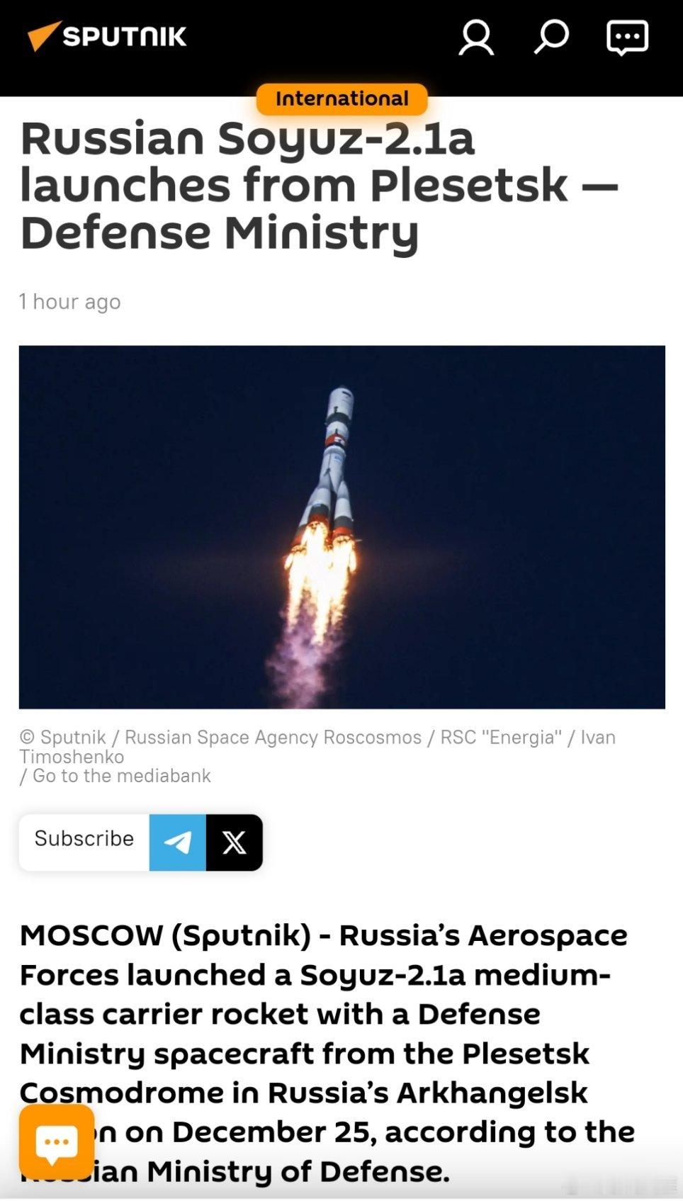 俄罗斯国防部:联盟-2.1a 运载火箭从普列谢茨克发射升空莫斯科(通讯社)——据俄罗斯国防部消息,俄罗斯国防部表示,此次发射及航天器送入预定轨道“均按正常模式进行”。该航天器按计划进入预定轨道,与地面系统保持稳定联系,其内部设备“运行正常”。