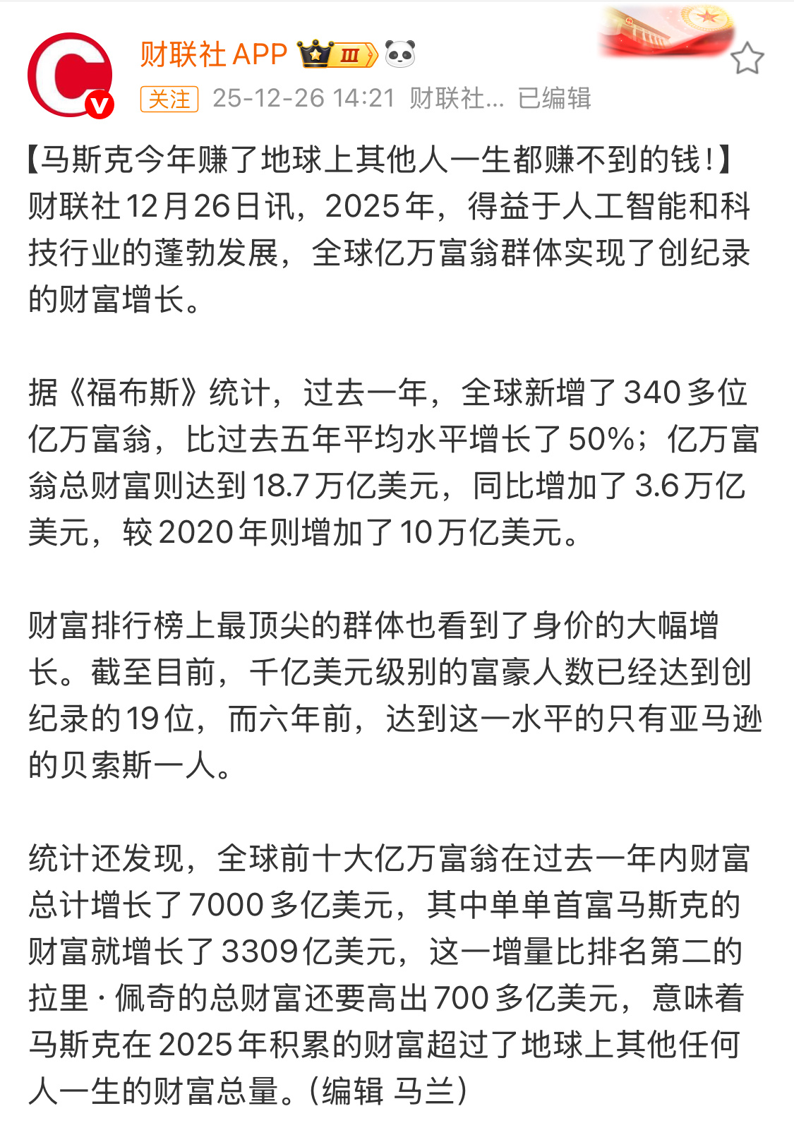 机器人和AI是生产资料,这生产资料属于谁?全民富裕的事说不好,马斯克很富裕是铁定的。今年,马斯克就赚了地球上其他人一生都赚不到的钱!