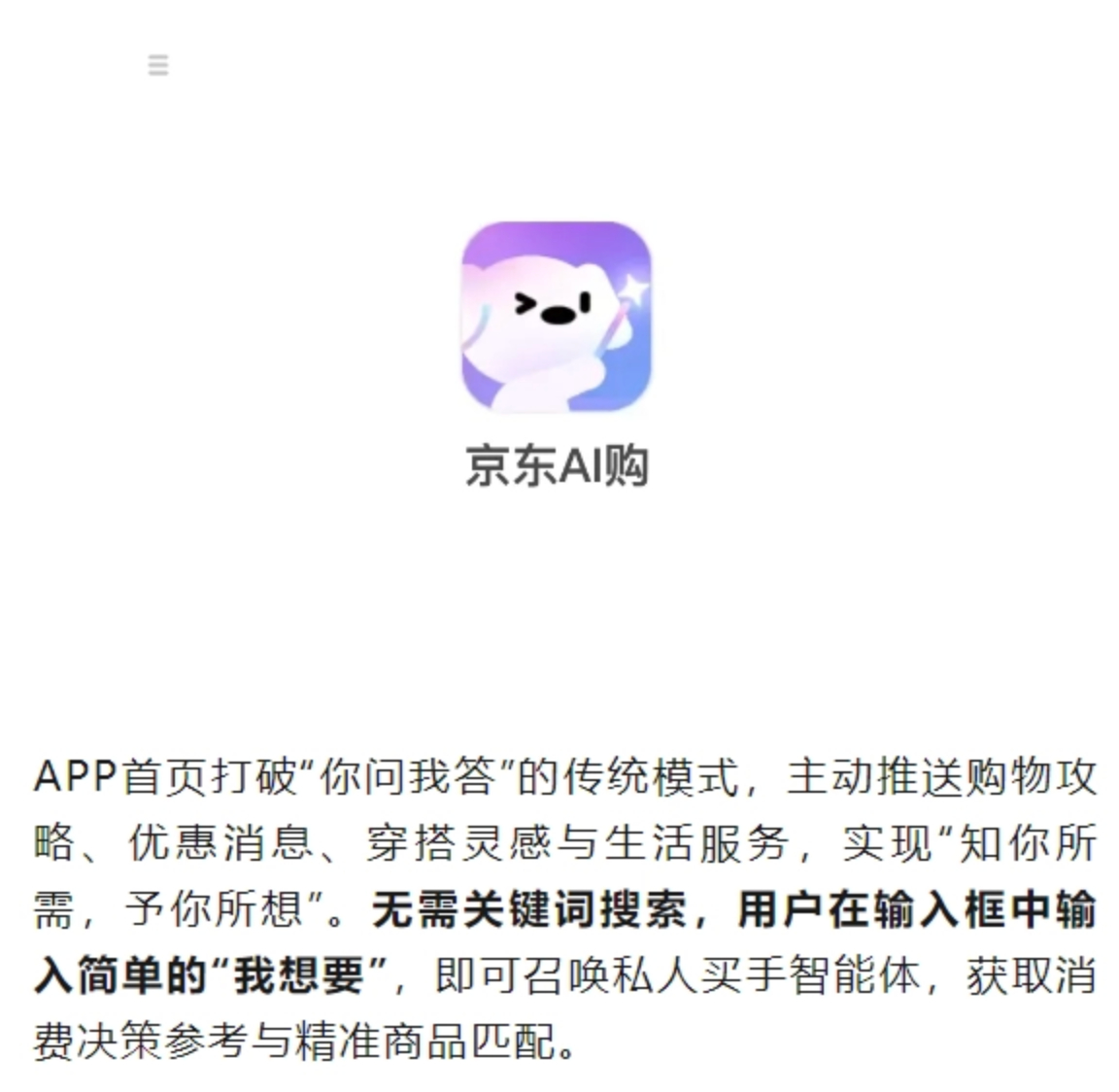 豆包手机“昙花一现”的原因找到了,各个平台都想要把自己的app做成自动的。有消息称,京东正在打造购物和生活服务的超级入口“京东AI购”App,产品定位“会思考、能购物、关心你”的生活服务助手。其实,京东不是第一个吃螃蟹的人,目前全球各大电商平台均在测试AI购物相关功能,美团首款AI Agent产品“小美”App,早在今年9月就已经开启了公测。内化AI能力,已经是趋势。但从消费者角度来看,新东西看着都很人性化,就怕到时候会优先推荐那些推广费给的比较多的商品。如果“AI购”能把全网比价做好,那还是非常值得期待的。