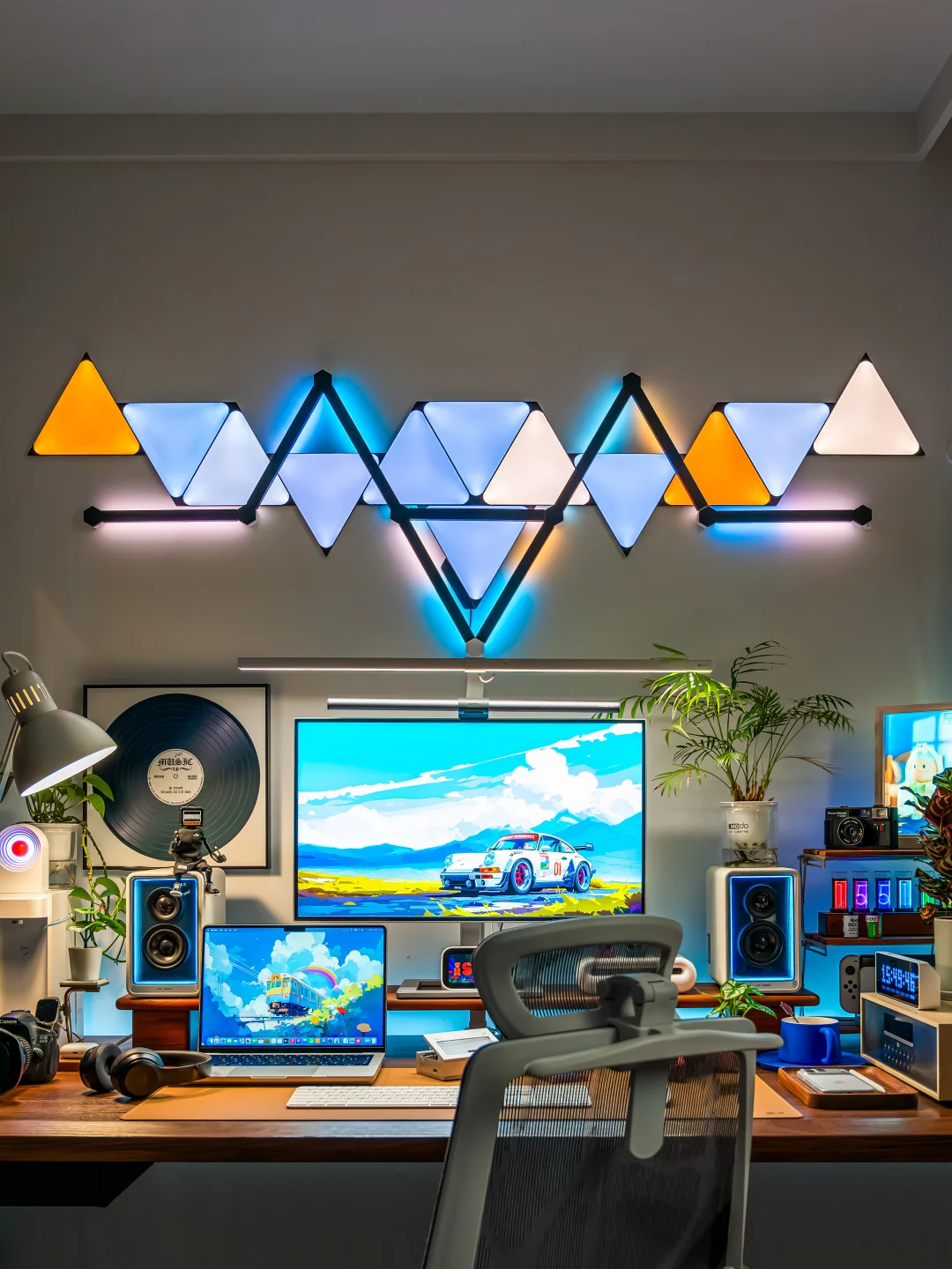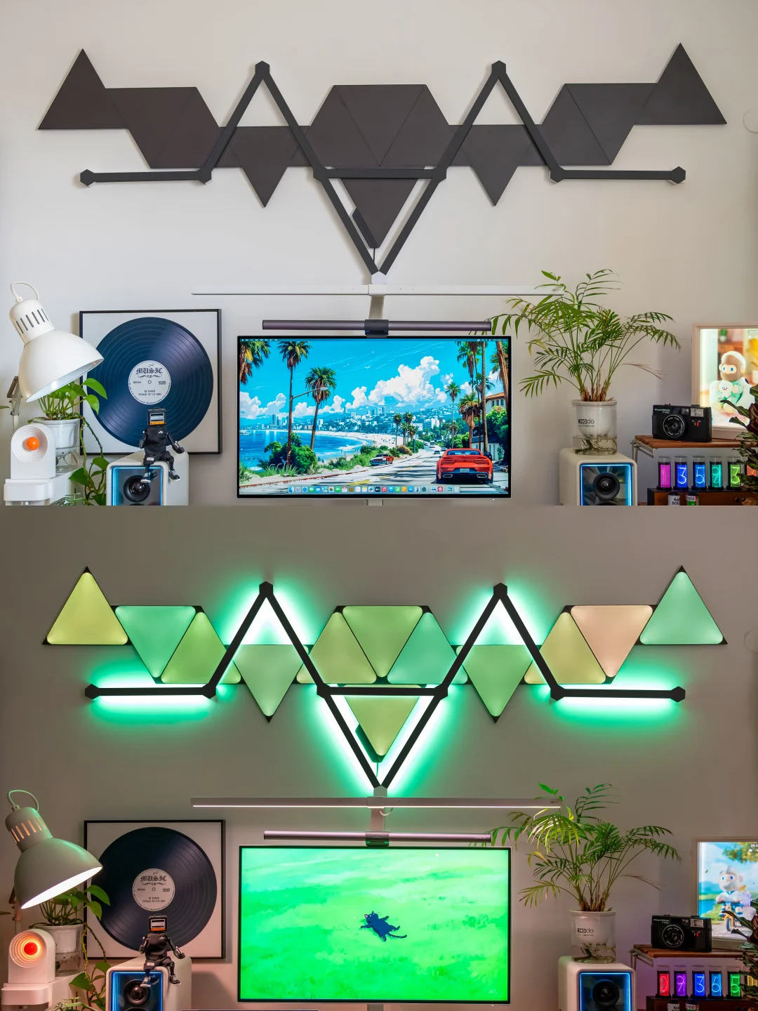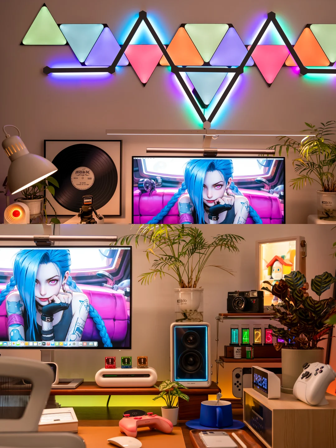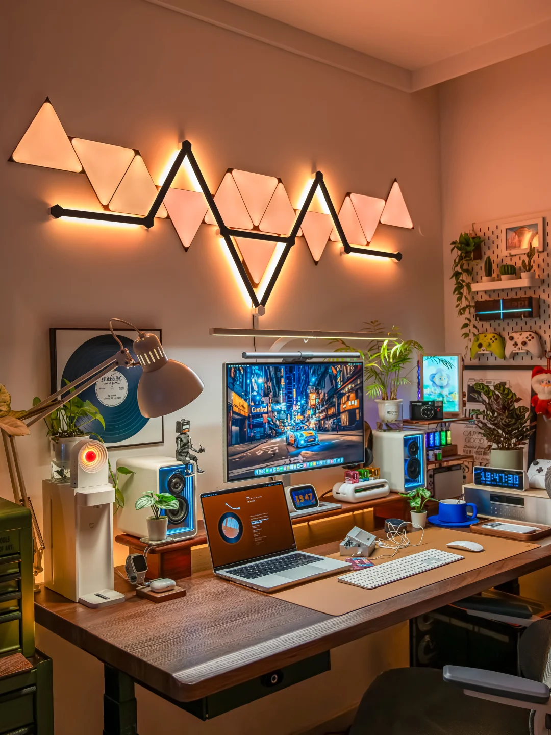 以前我的电竞房背景墙只是挂了两幅画,每次都会收到吐槽!作为一个喜欢分享桌搭的电竞爱好者,听这话真的忍不了!必须折腾起来,打造一面让人一眼惊艳的氛围感背景墙! ~ 都说“没有Nanoleaf的电竞房是不完整的”,于是果断安排了Nanoleaf的极夜奇光组合,我选的这个造型官方名字叫【星环引力】,直接把背景墙的颜值和氛围感拉满! ~ 说真的,奇光板和星座灯的组合真的绝了!比起单一的灯板或灯条,两者搭配起来造型感直接翻倍,墙面瞬间有了层次感和设计感,还没通电就已经觉得有那味儿了~ 而且安装过程比想象中简单太多!先在Nanoleaf APP里随心所欲设计自己喜欢的图案,然后按照APP里的指引在墙面上做好标记,再把灯板和灯条一一固定上墙,全程一个人操作,四十分钟就搞定了,手残党也能轻松驾驭! ~ 装好通电的那一刻这氛围感真的太顶了!不管是手机APP还是电脑软件,都能轻松控制奇光板和星座灯,颜色、亮度随便调, 而且APP里自带超多灯光效果预设,不管想换什么风格,一键切换就能get!更绝的是可以建一个群组,让奇光板和星座灯一体联动,灯光变化同步率百分百,视觉效果直接拉满! ~ 平时打游戏、看剧我必开“拾光同屏”和“拾音律动”这两个功能!打电竞时灯光会跟着游戏画面实时变化,游戏里的爆炸特效、技能光芒会同步映射在背景墙上,瞬间有种身临其境的沉浸式体验!看电影时灯光跟着剧情节奏切换色彩和明暗,在家也能拥有影院级的沉浸体验~听歌时就更快乐了!拾音律动功能,灯光会跟着歌曲的节奏变换跳动,慢歌时温柔渐变,快歌时疯狂闪烁,整个电竞房就像小型蹦迪现场,跟着音乐摇摆! ~ 当然,如果你想打造独一无二的专属氛围,也可以自己设计场景,给每一块灯板、每一段灯条都指定专属颜色和闪烁模式,我就花了一下午做了一套灯光方案,成就感满满! ~ 真心觉得,只要你想追求电竞房的氛围感,Nanoleaf的奇光板+星座灯套装真的是闭眼冲的存在!它不仅颜值高、安装简单,而且灯光效果超丰富。 现在我的电竞房每次开灯都觉得幸福感爆棚!这才是电竞房该有的样子! 奇光组合 nanoleaf奇光万物 奇光板diy 氛围感电竞房 数码大玩家 电竞房布置 电竞房改造 电竞房 桌面改造 桌搭 极夜奇光组合