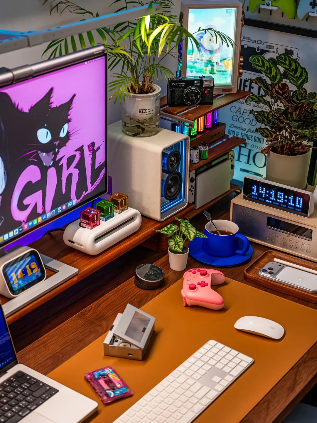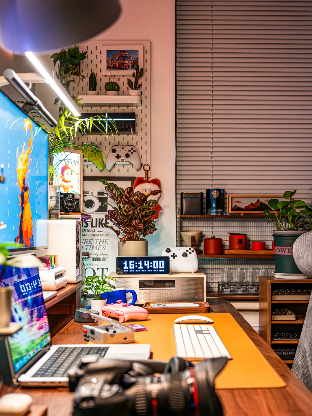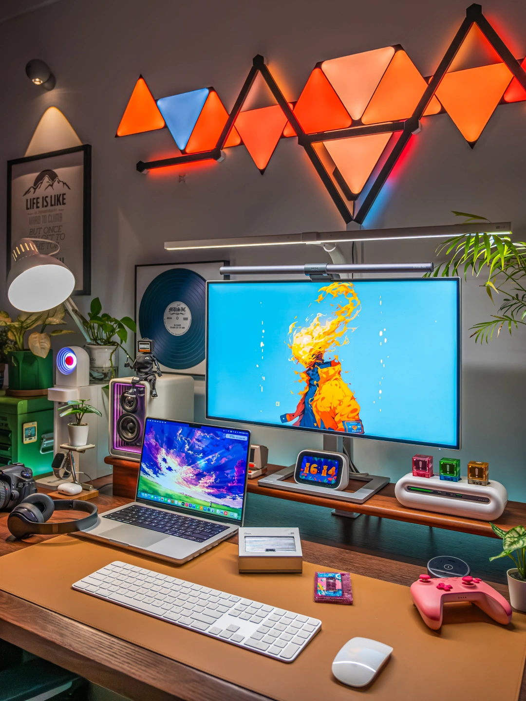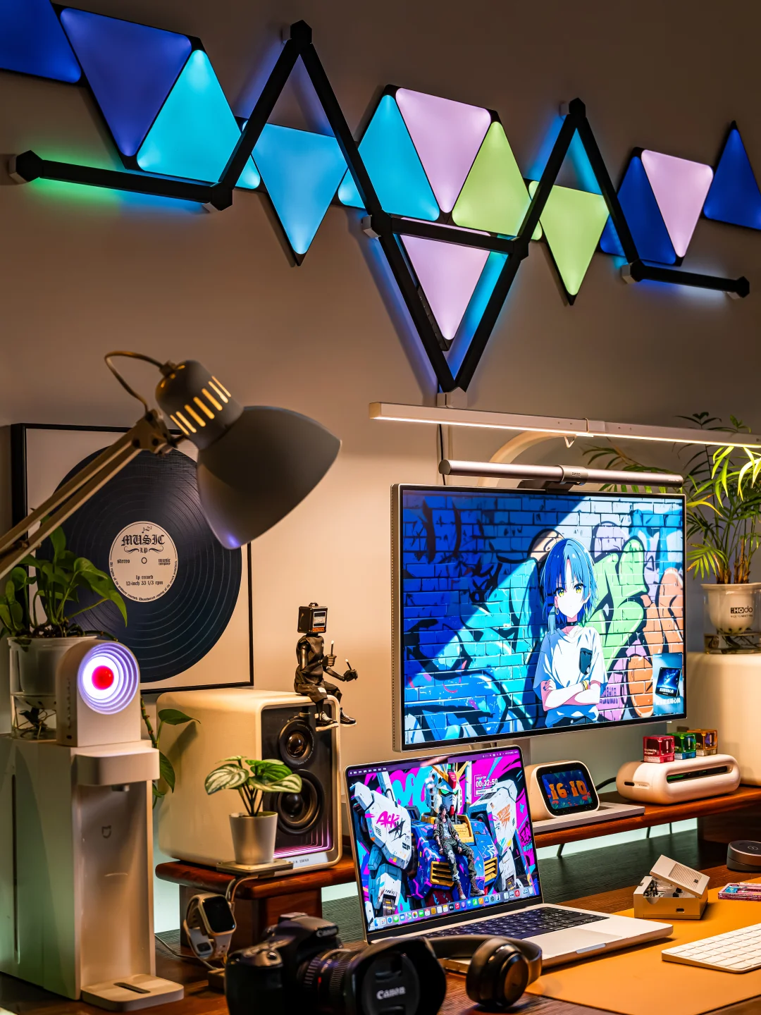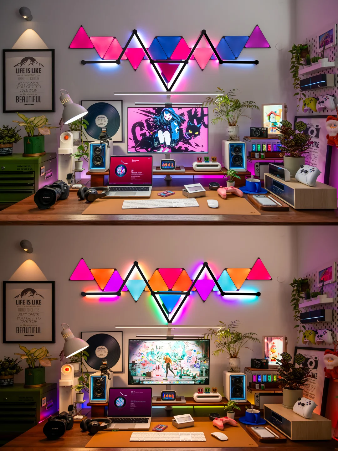 以前我的电竞房背景墙只是挂了两幅画,每次都会收到吐槽!作为一个喜欢分享桌搭的电竞爱好者,听这话真的忍不了!必须折腾起来,打造一面让人一眼惊艳的氛围感背景墙! ~ 都说“没有Nanoleaf的电竞房是不完整的”,于是果断安排了Nanoleaf的极夜奇光组合,我选的这个造型官方名字叫【星环引力】,直接把背景墙的颜值和氛围感拉满! ~ 说真的,奇光板和星座灯的组合真的绝了!比起单一的灯板或灯条,两者搭配起来造型感直接翻倍,墙面瞬间有了层次感和设计感,还没通电就已经觉得有那味儿了~ 而且安装过程比想象中简单太多!先在Nanoleaf APP里随心所欲设计自己喜欢的图案,然后按照APP里的指引在墙面上做好标记,再把灯板和灯条一一固定上墙,全程一个人操作,四十分钟就搞定了,手残党也能轻松驾驭! ~ 装好通电的那一刻这氛围感真的太顶了!不管是手机APP还是电脑软件,都能轻松控制奇光板和星座灯,颜色、亮度随便调, 而且APP里自带超多灯光效果预设,不管想换什么风格,一键切换就能get!更绝的是可以建一个群组,让奇光板和星座灯一体联动,灯光变化同步率百分百,视觉效果直接拉满! ~ 平时打游戏、看剧我必开“拾光同屏”和“拾音律动”这两个功能!打电竞时灯光会跟着游戏画面实时变化,游戏里的爆炸特效、技能光芒会同步映射在背景墙上,瞬间有种身临其境的沉浸式体验!看电影时灯光跟着剧情节奏切换色彩和明暗,在家也能拥有影院级的沉浸体验~听歌时就更快乐了!拾音律动功能,灯光会跟着歌曲的节奏变换跳动,慢歌时温柔渐变,快歌时疯狂闪烁,整个电竞房就像小型蹦迪现场,跟着音乐摇摆! ~ 当然,如果你想打造独一无二的专属氛围,也可以自己设计场景,给每一块灯板、每一段灯条都指定专属颜色和闪烁模式,我就花了一下午做了一套灯光方案,成就感满满! ~ 真心觉得,只要你想追求电竞房的氛围感,Nanoleaf的奇光板+星座灯套装真的是闭眼冲的存在!它不仅颜值高、安装简单,而且灯光效果超丰富。 现在我的电竞房每次开灯都觉得幸福感爆棚!这才是电竞房该有的样子! 奇光组合 nanoleaf奇光万物 奇光板diy 氛围感电竞房 数码大玩家 电竞房布置 电竞房改造 电竞房 桌面改造 桌搭 极夜奇光组合