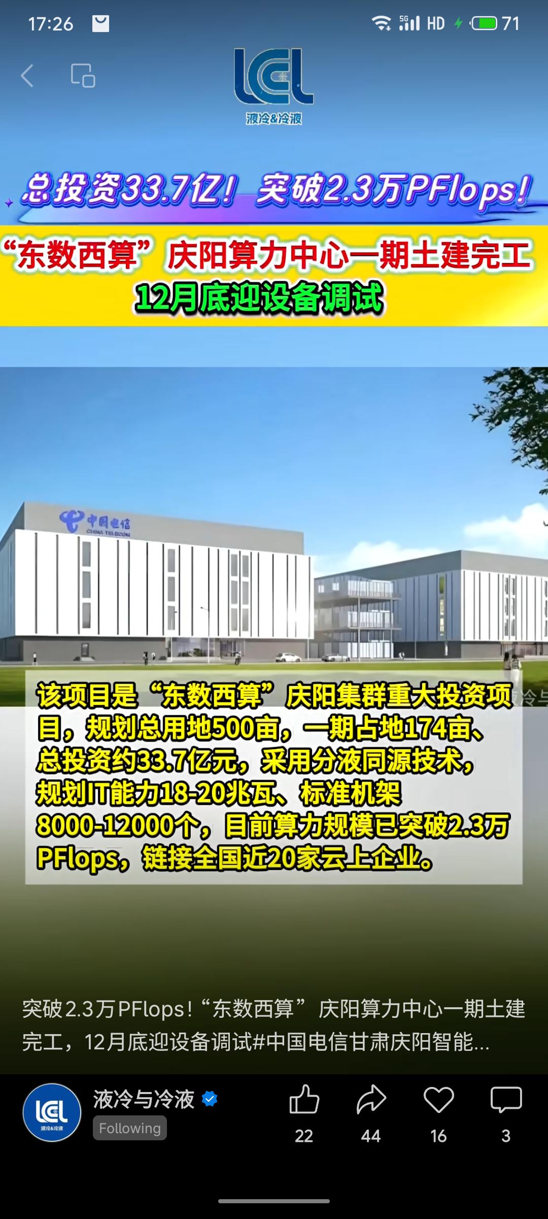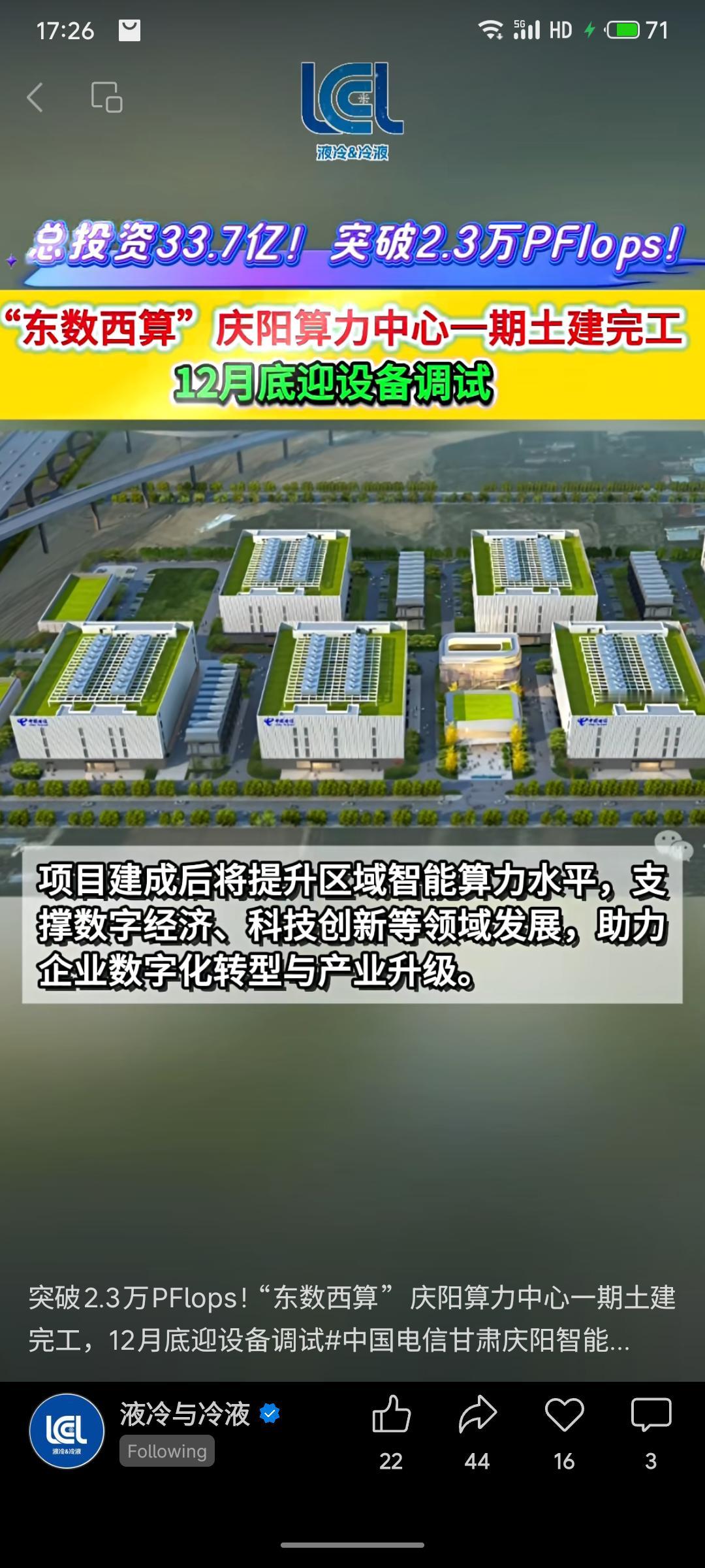 “东数西算”国家工程重要项目——甘肃庆阳智能算力中心一期土建完工,总投资33.7亿元,算力规模已突破2.3万PFlops。该项目采用先进技术,规划超8000个标准机架,链接全国近20家云企业,将于12月底进入设备调试阶段,旨在提升区域算力,支撑数字经济发展与产业升级。