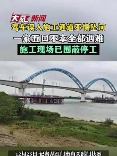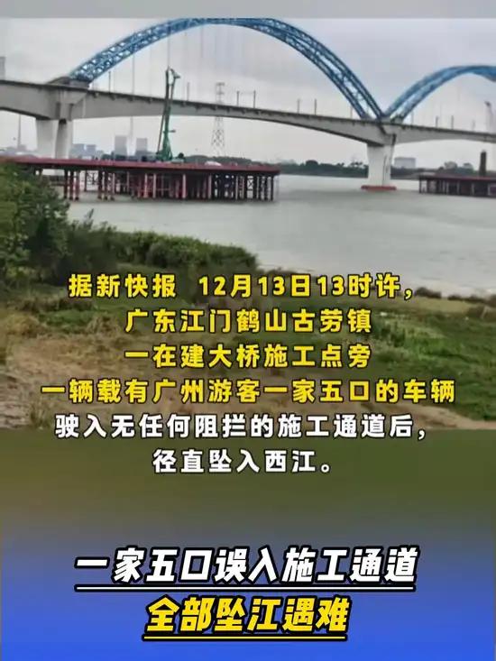 惊魂!一家五口误入“死亡通道”,坠江悲剧刺痛人心 2025年12月13日下午,广东江门鹤山市南新高速西江特大桥施工栈桥,被一场突如其来的悲剧蒙上了厚重的阴影——一辆载着一家五口的汽车坠入江中,五条鲜活的生命就此消逝。 西江特大桥,作为南新高速全线的核心控制性工程,自2024年底开工以来便备受瞩目,施工单位是中铁广州工程局。这本应是承载着交通发展希望的建设之地,却成了吞噬生命的“黑洞”。施工栈桥本仅供施工车辆进出,可现场却毫无安全围栏及阻拦设施,安全管控松散得令人咋舌。周边村民早已忧心忡忡,此前就发现常有村民、路人随意进出,安全隐患如影随形,没想到悲剧终究还是降临。 遇难的这一家五口,是来自广州的游客,原本怀着愉悦的心情到古劳丽水周边游玩,却在傍晚驾车返程时,因驾驶员误入施工通道,瞬间坠入江中,美好的旅程戛然而止。 事故发生后,施工现场迅速围蔽停工。古劳镇政府党政办麦树锦主任表示,目前正全力安抚遇难者家属,事故调查及善后处置工作也在紧锣密鼓地推进,后续会第一时间向社会通报。 这起悲剧,是血的教训,敲响了安全警钟。我们期待相关部门能彻查此事,厘清各方责任,让逝者安息,给家属一个公正的交代。也希望这样的悲剧不再重演,每一个施工现场都能筑牢安全防线,守护每一个生命的安全。
