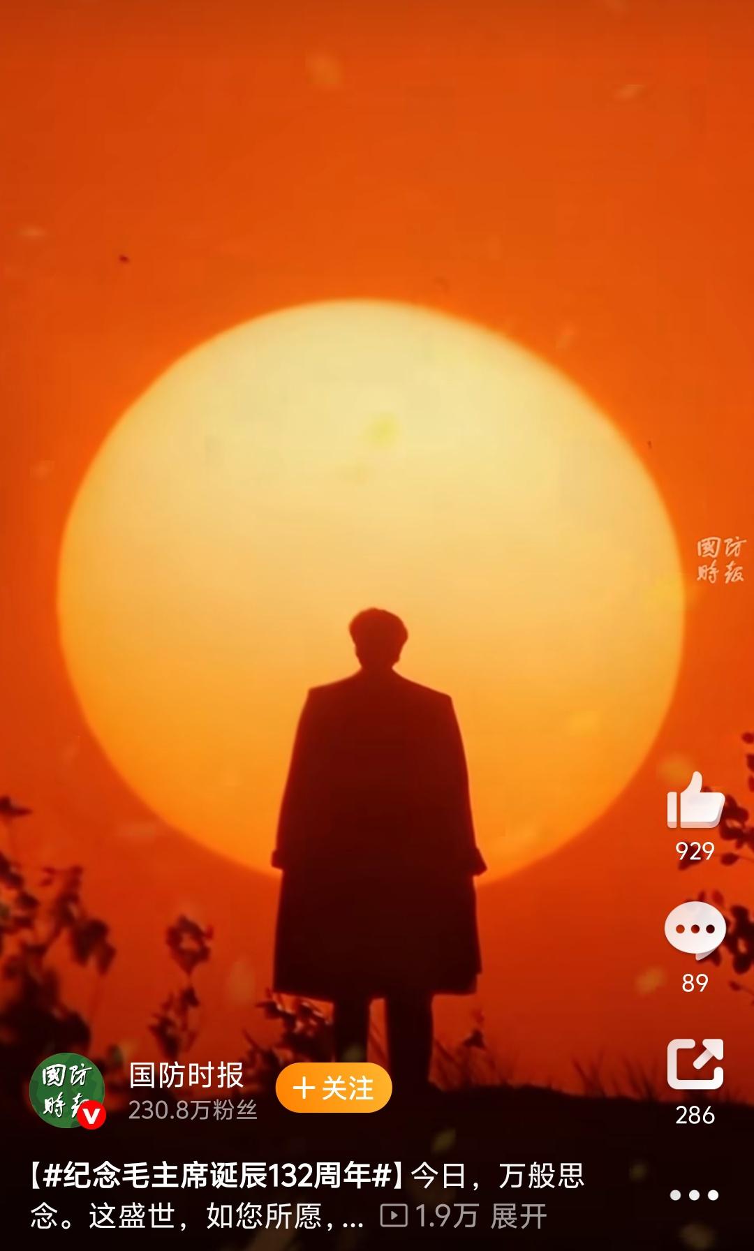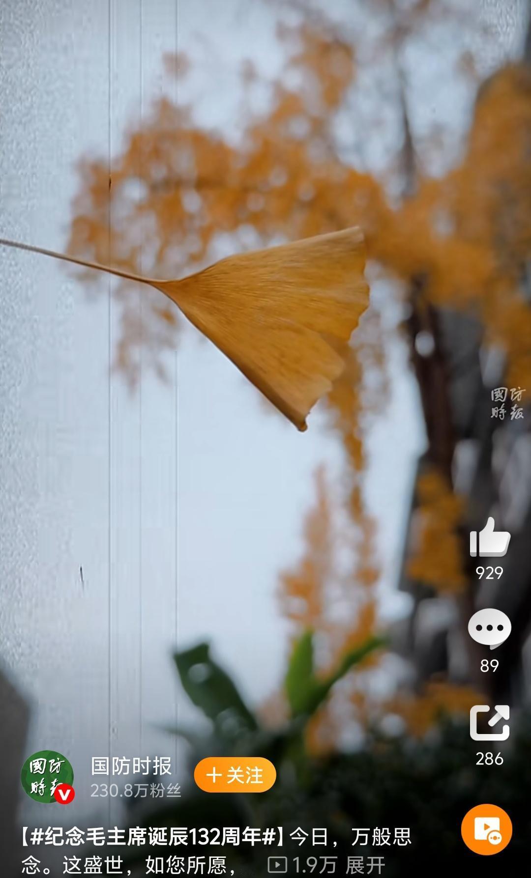 纪念毛主席诞辰132周年 韶山万人齐唱东方红 人民日报简洁明了 国防时报的视频就有意思了 一片银杏叶飘落之后,日出东方,映出了毛主席伟岸的背影。 银杏叶,银杏叶
