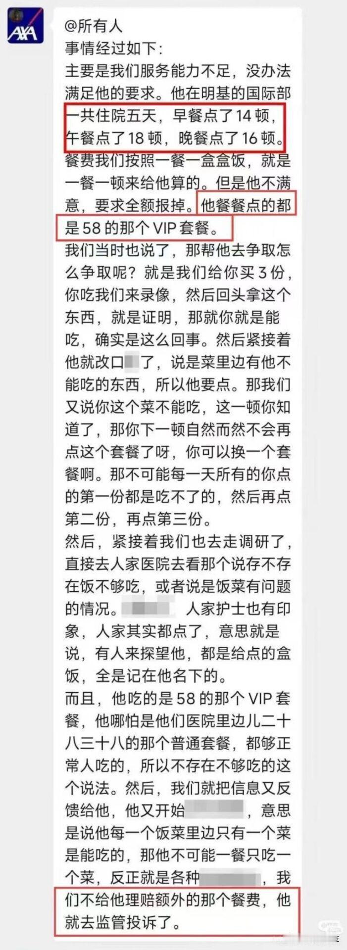 都有理,到底谁有理!一个客户人保险加入了黑名单,然后他转投另一家保险公司,同样被拒保!风控不过!他气不过直接去投诉了,保险公司也很委屈! 保险公司说是因为他们服务能力不足!没办法满足他的要求。据说这个客户他在明基的国际部共住院五天,光早餐点了14顿,午餐点了18顿,晚餐点了16顿,把保险公司给吓着了! 而保险公司餐标是盒饭!他不满意!要全额报销! 保险公司也说了,你吃可以,录个像证明你真吃了,他又没法录像! 真是公说公有理,到底谁有理?