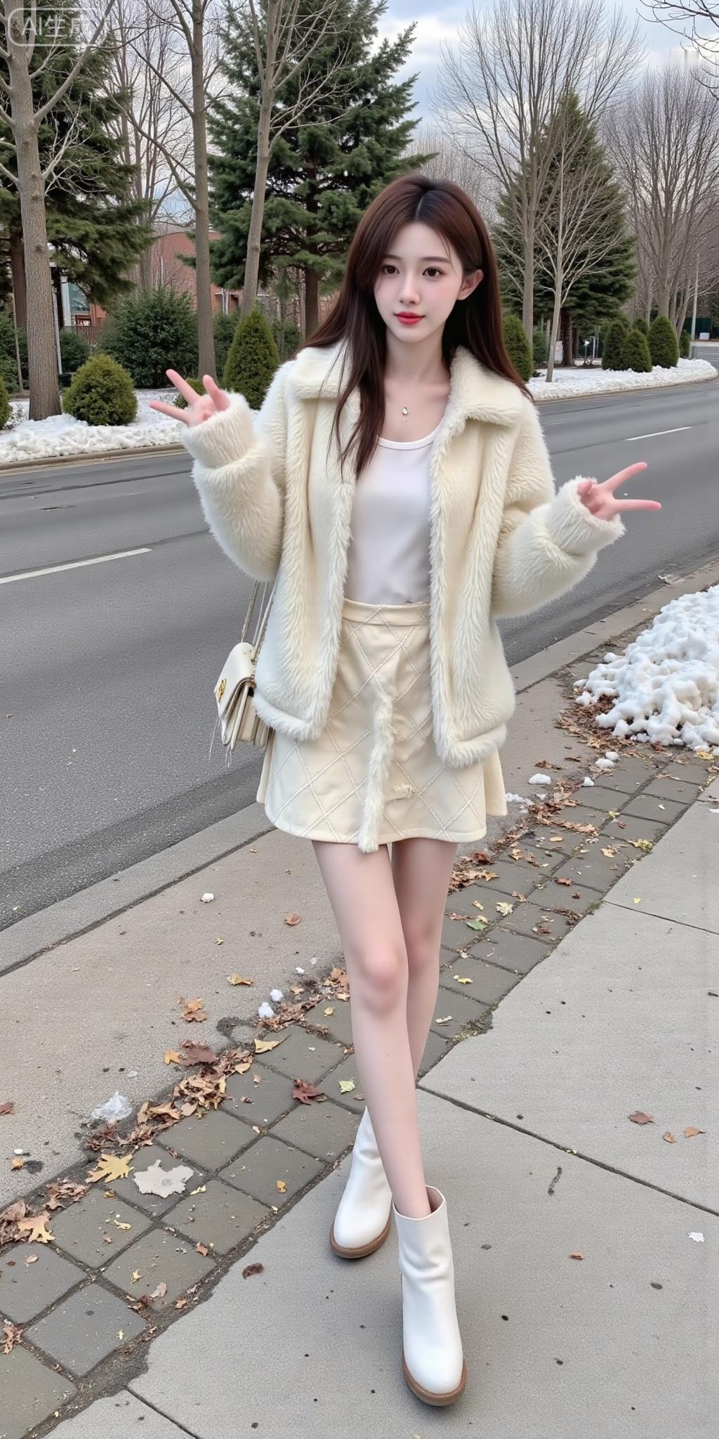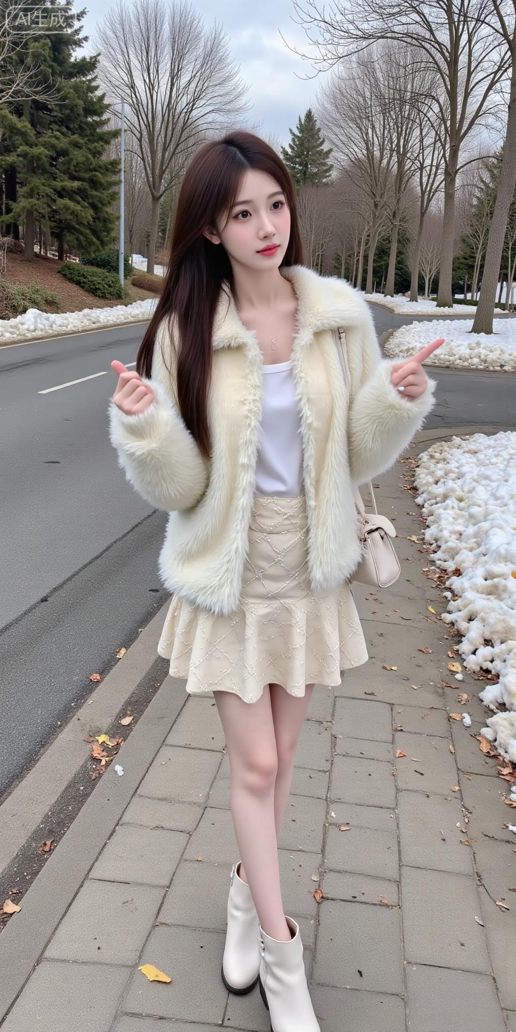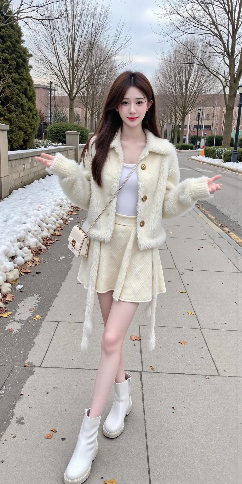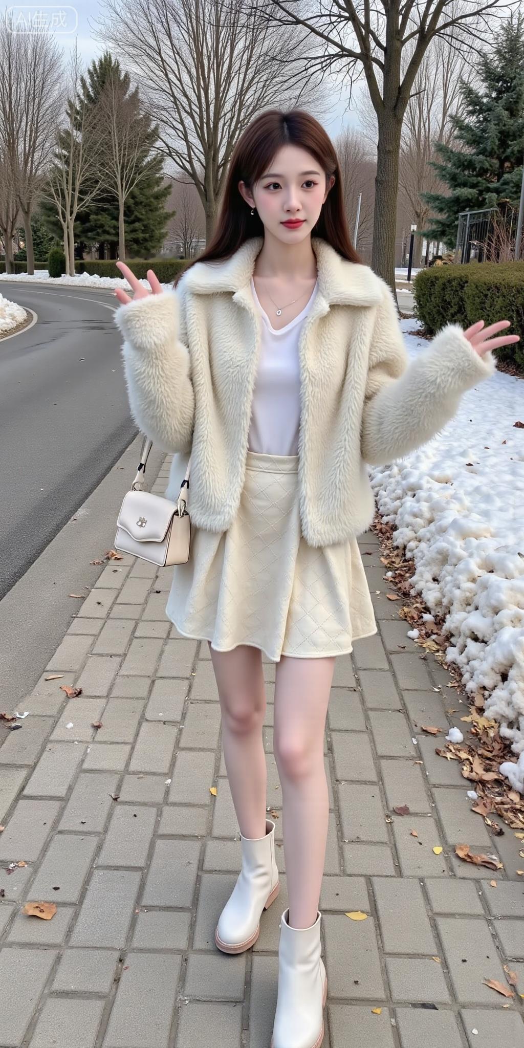 毛绒外套配白靴,落雪旁的温柔甜妹太戳毛绒外套女冬季