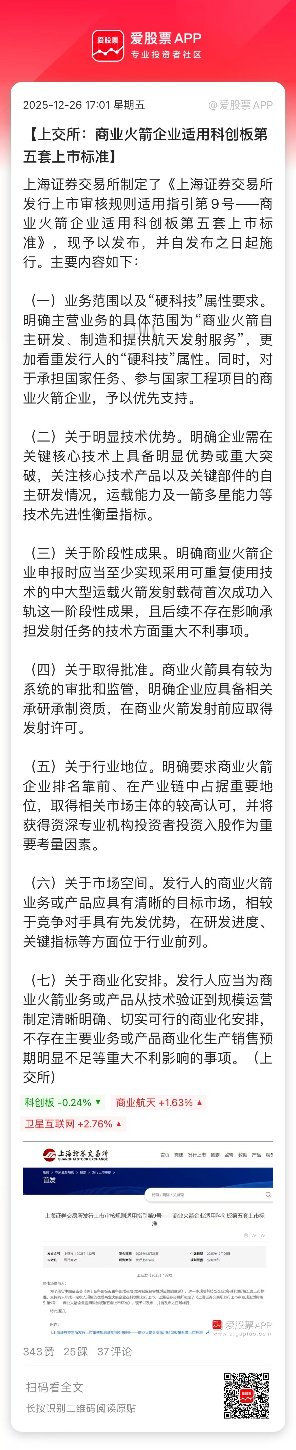 上交所又给商业航天带货了,商业火箭企业适用科创板第五套上市标准。意味着亏损企业可以上市,跟摩尔线程、沐曦股份待遇一样了! 目前看,蓝箭航天已经完成IPO辅导,有望成为第一家冲刺A股上市的。蓝箭航天的“朱雀三号”已经完成国内首飞尝试一级火箭回收,虽说失利,但实现了多项技术突破。 总之,商业航天公司IPO窗口打开,蓝箭航天、中科宇航、天兵科技、星河动力都在排队,这又是一场资本市场超级盛宴!要知道如果SpaceX登陆美股,市值估计给到1万亿美元;中国的SpaceX们不得值2000、3000亿人民币啊! 就像摩尔线程、沐曦,在一级市场就值200、3000亿;上市后就是3000、4000亿了。这是最好的时代,国家支持的新兴行业能大量创富;这是最差的时代,很多老登行业没人理,拿着老登股的也只能暗自伤神了。