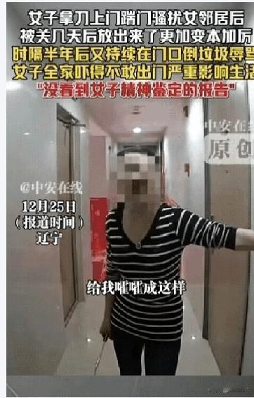碰上这样的邻居咋办[尬笑]?辽宁一女子晚上睡觉,突然门被砸响,女子很害怕连忙打开监控发现竟然是女邻居拿菜刀在砍门。 女子看到这种情况,很害怕,于是果断报警处理。 结果警察把女子关了几天后,女子出来不但没有反思,反而变本加厉。 只见她时不时在女子门口倒一堆垃圾,时不时在她家门口上演一幕又脏又恶毒的诅咒谩骂。 那么到底是因为什么导致女邻居总是这样呢? 原来女邻居说自己被脑辐射了,而辐射来源就是女子家。 女子一家不堪其扰,后悔万分。都是买二手房时没有了解清楚,这才导致这种闹心事。女子一家看着还没住多长时间的新家,精神都快崩溃了。 好在后来公安局正式立案了,还把女邻居送到精神病院做鉴定,但直到现在,她还没看到鉴定报告,女邻居的骚扰也没彻底停止。 这一幕也引发了网友的热议。 有的网友说:这种人就是打轻了,如果她来骂一次,房主就开门暴揍她一顿,来一次暴揍一次,保证她就再也不敢来了。 有的网友说:有精神病送精神病院治病,没病送拘留所!不能让无辜的人整天提心吊胆的生活,这是社会的底线。 有的网友说:前业主肯定是受不了才走的。买二手房一定多做一些前期工作,确定前,多去小区了解左邻右舍,楼上楼下住户,别只盯着价格! 有的网友说:这种人好治,狠狠地揍她就行了,一次把她打怕了,你只有一次机会,混不吝的人怕不要命的人。 …… 碰到这样的邻居,得有一颗多强大的内心呀? 如果是你,你会咋办?