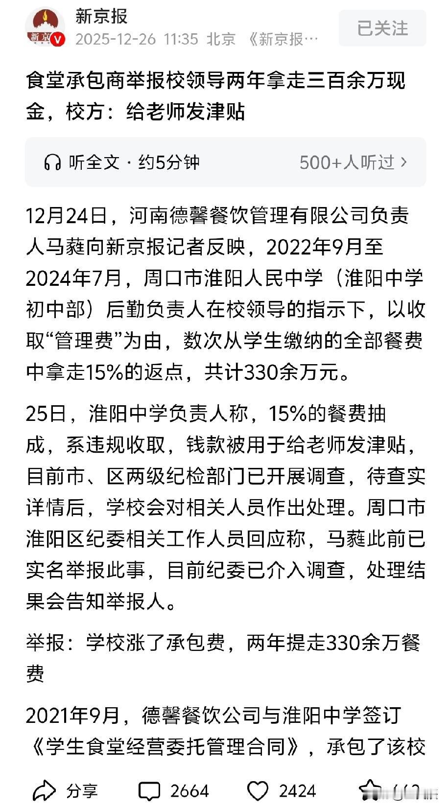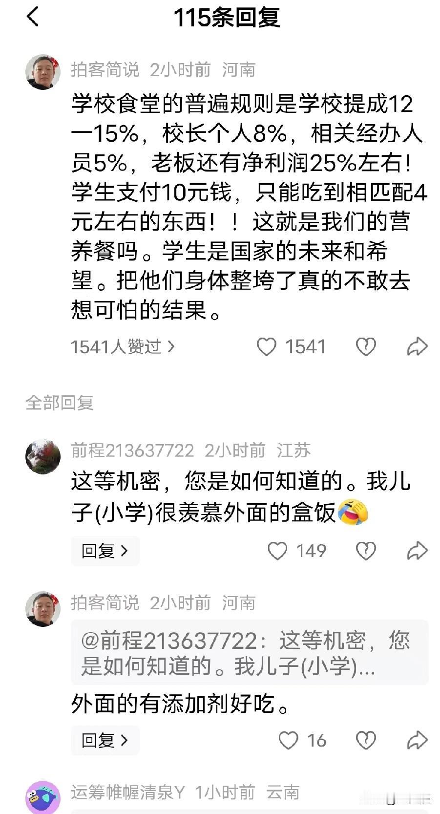 河南周口淮阳中学初中部的食堂承包商被抽取高额管理费事件曝光,更多内幕可能掩盖不了了! 两年时间,3000名学生的食堂餐费被学校后勤人员从承包商的营业额中硬生生拿走300多万元,平均每个学生1000元。而且这笔钱是在正规签订的合同管理费上增加的部分,就这,食堂承包商还向媒体说他们是按照学生缴纳的每人每天20元三餐的标准出餐,能可信吗? 真的是因为承包三年食堂赔了几百万才愤而爆出内幕并实名举报?据我的判断,这家德馨餐饮公司如果是正常中标,根本不会怯于校方明显违反合同约定条款的行为,在2022年9月事发时就大胆举报告发了,没必要最后自己赔个底朝天才翻脸,估计应该还有内情,留待当地纪检部门查明。 有行业人士在媒体报道的评论区爆出“潜规则”,说是学校食堂的利润分配是学校提成12-15%,校长个人8%,相关经办人5%,老板还有净利润25%左右。拿淮阳中学为例,学生每人每天缴纳20元餐费,只能吃到相匹配的8元左右的东西!就现在的消费水平,一天三顿饭8元钱成本能用上好食材?难怪很多家长都奇怪自己的孩子为啥不吃校餐要点外卖!也难怪学校一出现集体食物中毒的事故,都是因为食材出了问题,到最后查不下去,感情校领导拿了那么多“回扣”,不护着藏着还不把自己整进去了? 这一回,倒希望周口纪检和教育部门能真的调查清楚,让孩子们不再吃亏心餐。