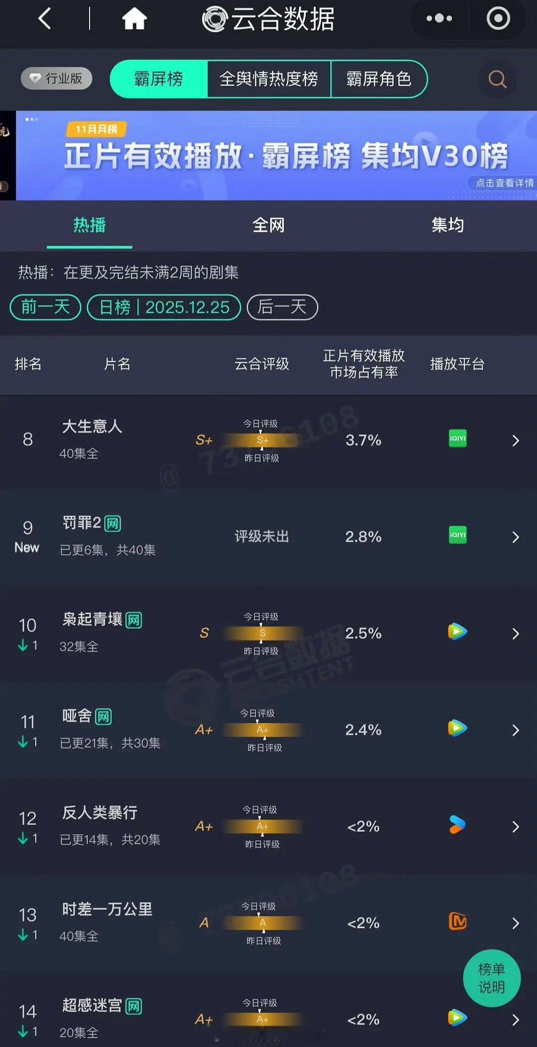 12.25云合:老舅26.2% 骄阳似我12.5% 长安二十四计12.4% 罚罪2空降首播8%