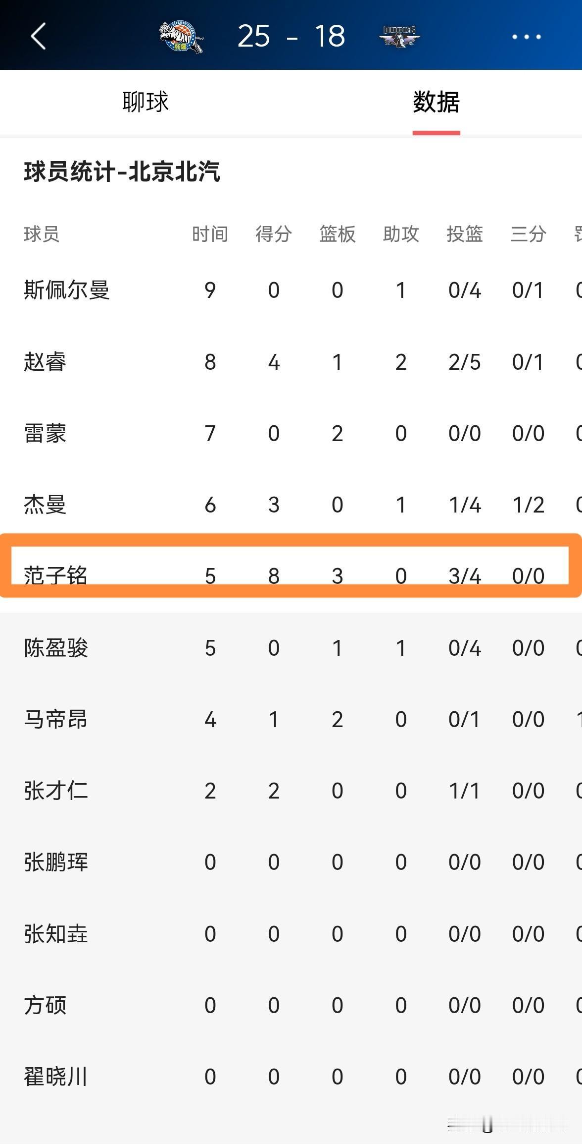 北京北汽大将范子铭真是让人大吃一惊!在今天北京北汽客场挑战新疆伊犁特的焦点战中,目前双方的首节比赛已经结束,虽然北京北汽以18:25落后于对手,但是顶替周琦首发出场的范子铭却打出了非常出彩的表现。 在第一节比赛中,范子铭首发出战5分钟,投篮4中3,其中罚球2中2非常高效的砍下8分3篮板,他的场上正负值为全队最高的+4。 作为一名顶薪球员,范子铭终于用自己的出色表现证明了自己的价值。