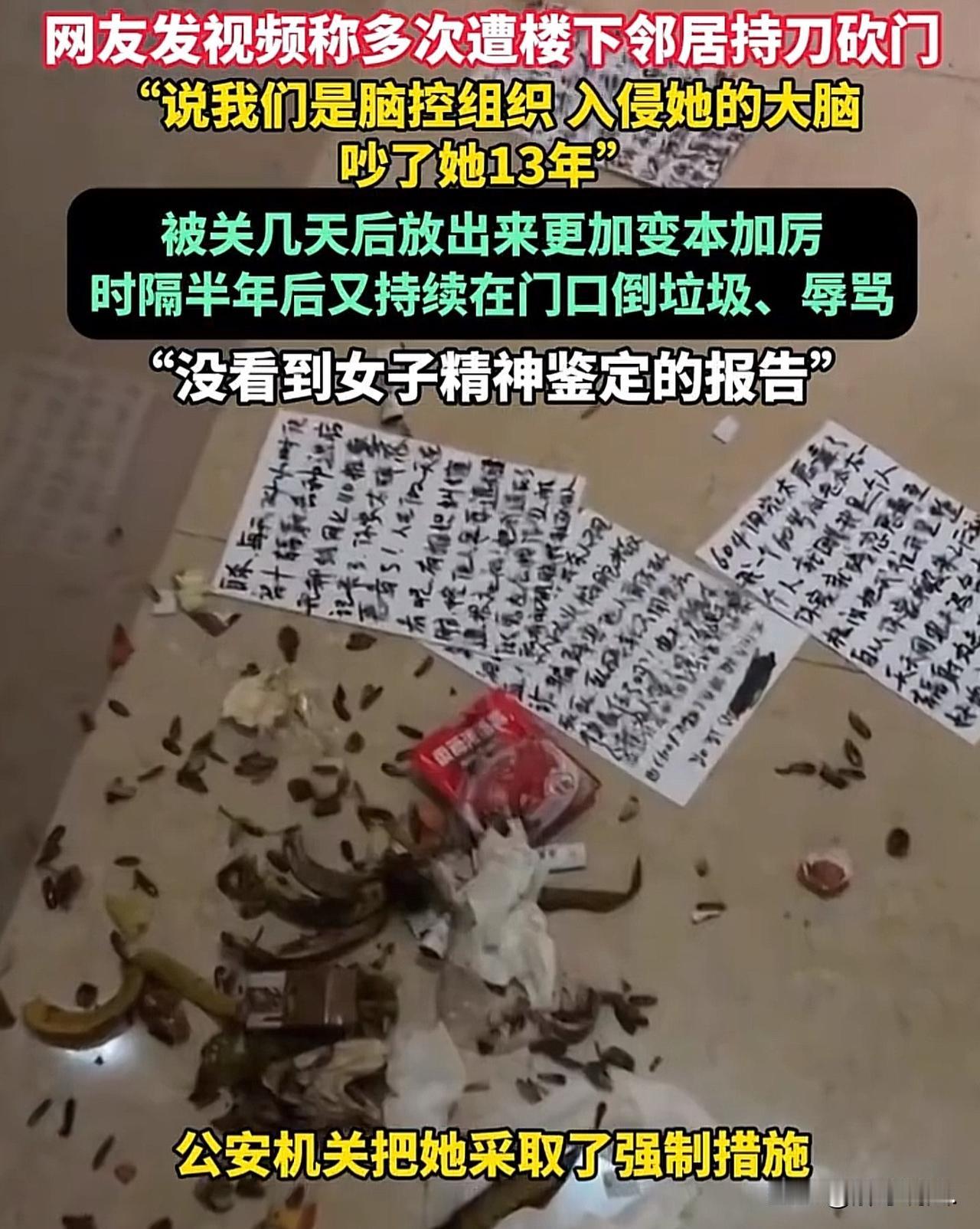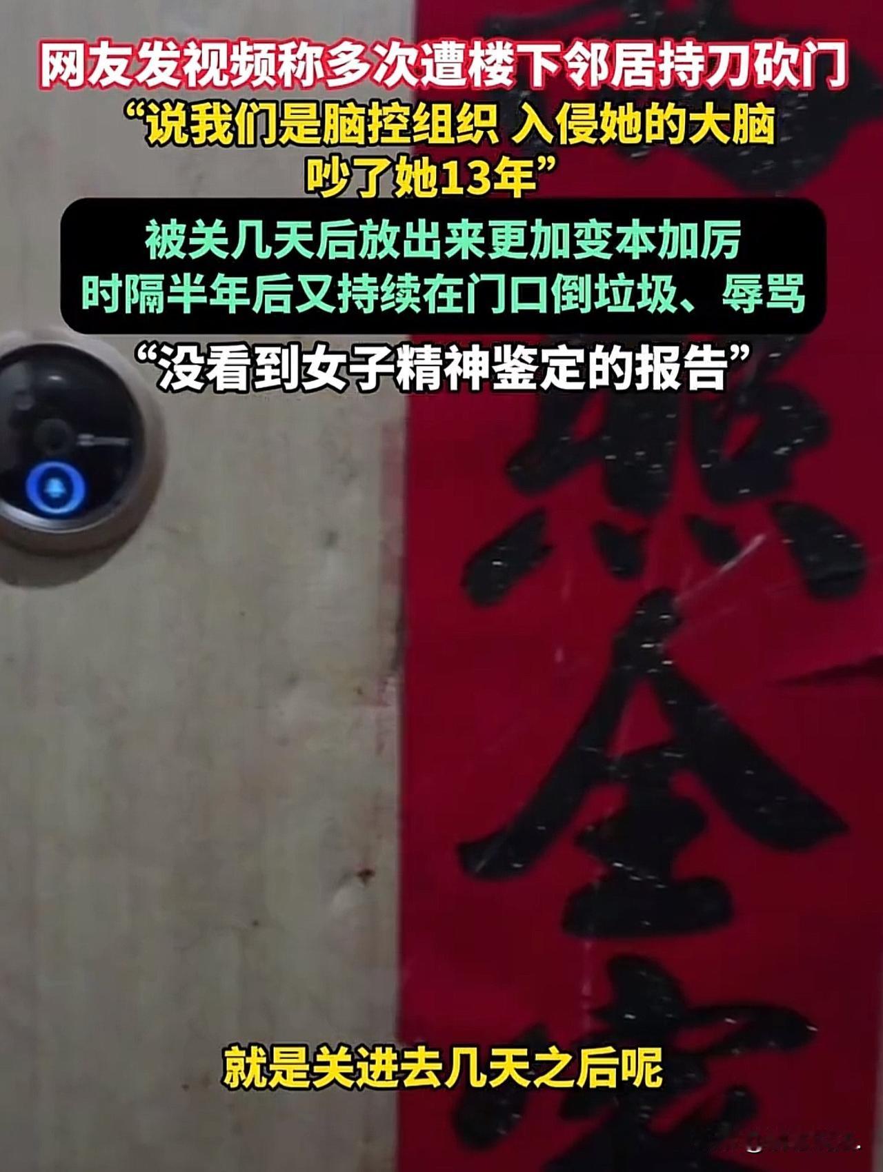 辽宁,女子家多次遭楼下女邻居持刀砍门,搅得她们一家不得安宁,无奈之下,女子报警,女邻居说,女子家辐射了自己的大脑,吵了自己13年。女子喊冤,称自己刚搬来3年。警方将女子拘留,谁知,女邻居被关几天后,放出来更加变本加厉,又持续在女子家门口倒垃圾,辱骂。目前,警方已正式立案了,同时,还把女邻居送到精神病院做鉴定。 刘女士怎么也想不到,自己掏半辈子积蓄买的二手房,没换来安居乐业的好日子,反倒成了全家人的噩梦。 个月前,一天晚上,刘女士一家在睡梦中被睡“哐哐哐”砸门的响声惊醒。 刘女士吓得心脏“咚咚”狂跳,第一反应是邻居喝醉酒耍酒疯了。 毕竟住的是老小区,邻里之间偶尔有点小动静也正常。 刘女士不敢出声,悄悄摸出手机,点开了门口的监控。 这一看,魂儿差点没飞了。监控画面里,隔壁的女邻居正攥着一把明晃晃的菜刀,一下下往自家门上砍! 刀刃撞在铁门的金属框上,发出刺耳的摩擦声,那架势哪里是耍酒疯,分明是想破门而入! 刘女士腿都软了,赶紧叫醒身边的丈夫,两个人缩在卧室里,大气不敢出一口,直到女邻居砍累了,骂骂咧咧地回了家,刘女士才报了警。 刘女士想不明白,和女邻居平日里无冤无仇,美任何过节,女邻居她为什么会做举动。 警察来得很快,也很快找到了那位女邻居。 可让人匪夷所思的是也不是酒后失控,她给出的理由,她说刘女士家在“用脑辐射攻击她”,她砍门,是为了“反击”。 刘女士才这才后知后觉地想起,自己刚搬来的时候,就在小区业主群里见过这位女邻居发的奇葩言论。 当时她还说,小区里有人用辐射害她,搞得她浑身不舒服,那时候刘女士只当是有人在群里发神经,压根没往自己身上想。 谁能料到,这位女邻居口中的“辐射源”,竟然就是自己家! 刘女士买的是二手房,搬进来之前跟这位女邻居素不相识,连话都没说过几句,怎么就平白无故成了“辐射凶手”? 任她怎么解释,女邻居都油盐不进,认定了就是刘女士一家在害她。 从那以后,刘女士家的日子就彻底掉进了地狱。菜刀砍门只是开胃小菜,更恶心的还在后头。 女邻居开始变着法子地骚扰刘女士一家。最常见的,就是拎着一袋袋垃圾往她家门前倒。 烂菜叶、馊掉的剩饭、用过的塑料袋,甚至还有不知道从哪捡来的脏东西,一股脑堆在刘女士家门口。 每天早上一开门,扑面而来的就是一股子酸腐的恶臭,脏水顺着门缝往屋里渗,苍蝇蚊子嗡嗡地围着垃圾堆打转,好好的家门口,硬是被折腾成了个露天垃圾场。 光是倒垃圾还不够,女邻居还喜欢站在刘女士家门口骂街。 每天不定时,她就搬个小马扎往门口一坐,扯着嗓子开骂,那些话脏得让人听不下去,什么恶毒的诅咒都往外飙,路过的邻居听见了,都赶紧低着头快步走开,没人敢上前劝一句。 刘女士试过跟她讲道理,可话还没说两句,就被对方的胡言乱语怼了回来;她也试过找物业帮忙,物业上门调解,被女邻居骂了个狗血淋头,到最后也只能摆摆手,说管不了。 没办法,刘女士只能一次次报警。 警察来了之后,也只能对女邻居进行口头教育,或者带去派出所做心理辅导。 有两次,实在是闹得太过分了,警察采取了强制措施,把女邻居关了几天。可谁知道,放出来之后,她的骚扰变本加厉,比以前更凶了。 后来警察再来,看着刘女士一家憔悴的样子,也只能无奈地劝:“你们先别管,尽量别跟她正面冲突,免得激怒她。” 这话听着好心,可对刘女士一家来说,却一点用都没有。不冲突?怎么可能不冲突!女邻居就堵在家门口,骂声从早到晚没停过,垃圾堆得出门都费劲,难道要一家人天天憋在屋里,连门都不敢出吗? 这三个多月里,刘女士一家活得像惊弓之鸟。白天不敢开窗,怕飘进来的骂声和臭味影响孩子;晚上不敢睡熟,总怕门外又传来菜刀砍门的声音。 好好的一个新家,硬是被折腾成了一座让人喘不过气的“牢笼”。 大人吃不好睡不好,精神恍惚,就连家里的孩子,也因为长期担惊受怕,变得沉默寡言,不敢跟同学说自己家住在哪儿。 目前,公安局正式对这件事立案了,还把女邻居送去了精神病院做司法鉴定。 可鉴定报告迟迟没出来,而女邻居的骚扰一直没有停止。 《治安管理处罚法》第42条规定,多次发送侮辱、恐吓或者其他信息,干扰他人正常生活的,处五日以下拘留或者五百元以下罚款….. 而她持刀砍门的行为,还可能涉嫌寻衅滋事,若造成财物损失或人身威胁,还需承担相应的民事赔偿责任甚至刑事责任。 另外,若精神病院的鉴定结果显示女邻居确实患有精神疾病,且其行为是在发病期间所为,那么,女邻居的监护人需要承担起相应的监管责任,避免类似的骚扰行为再次发生。