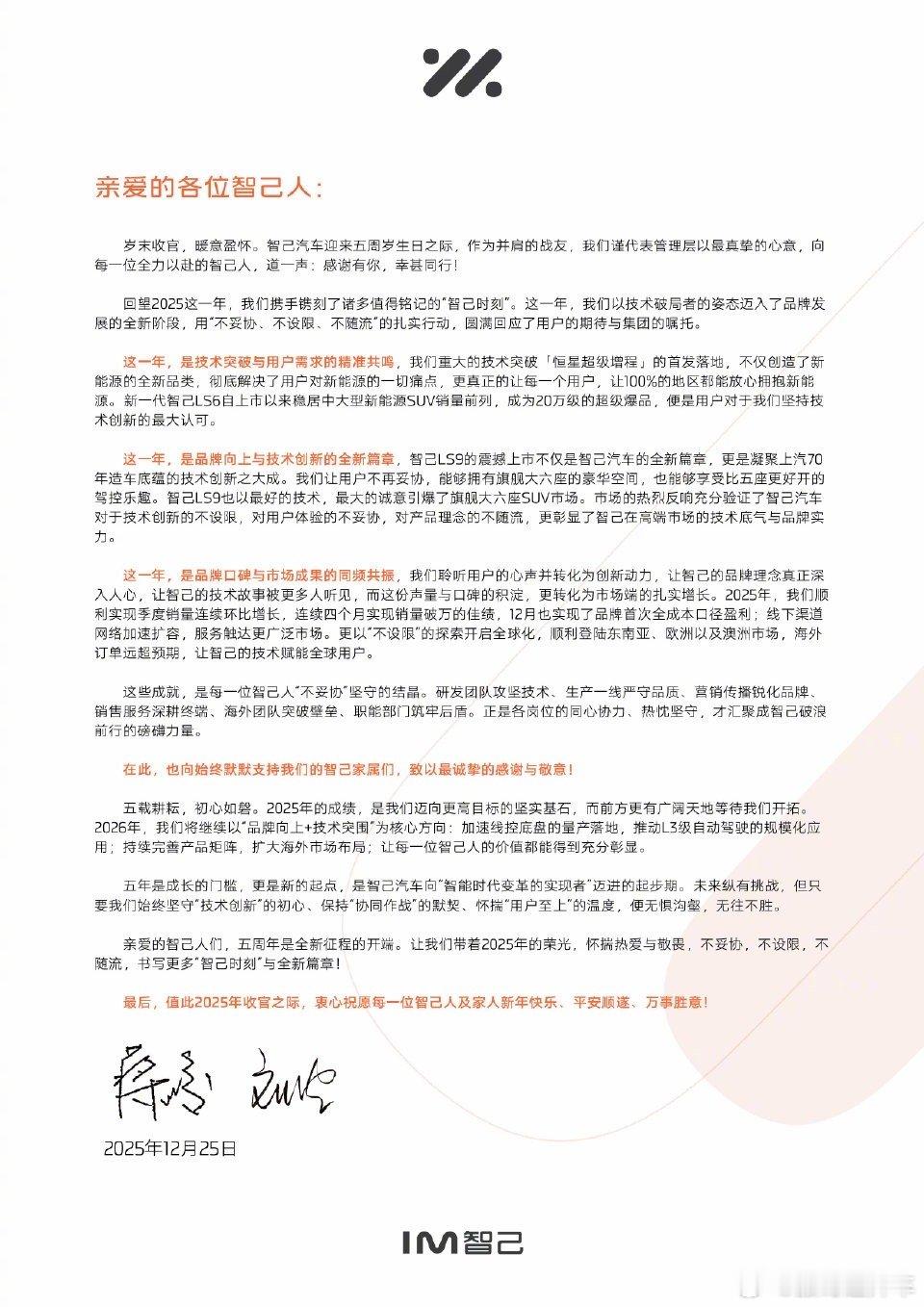 智己五周年实现单月盈利大v聊车新能源汽车 智己汽车在成立第五年关键节点,交出了一份亮眼的答卷。从9月开始销量连续四个月破万,更关键的是12月首次实现全成本口径盈利!当然这背后离不开技术和产品助力:智己新推出的恒星超级增程技术,解决了电动车在北方冬天怕冷、续航短的痛点,成了很多北方用户的首选。同时,新一代智己LS6和LS9两款车,用扎实的技术和实在的配置,赢得了消费者的青睐!