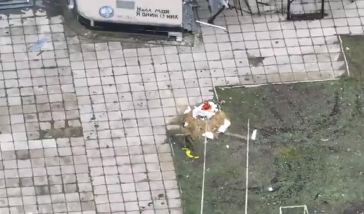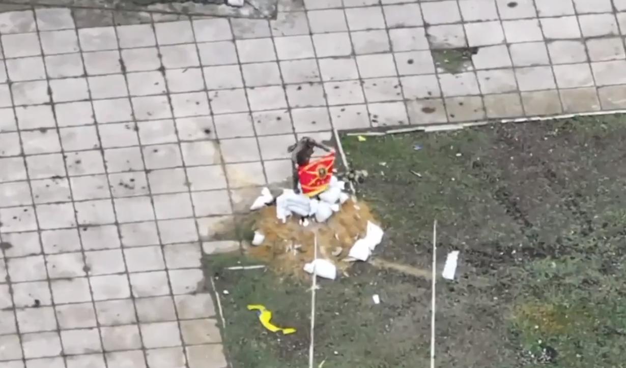在胡利亚伊波列市中心,一名俄罗斯士兵正在将第57旅的旗帜披在涅斯托尔·马赫诺的雕